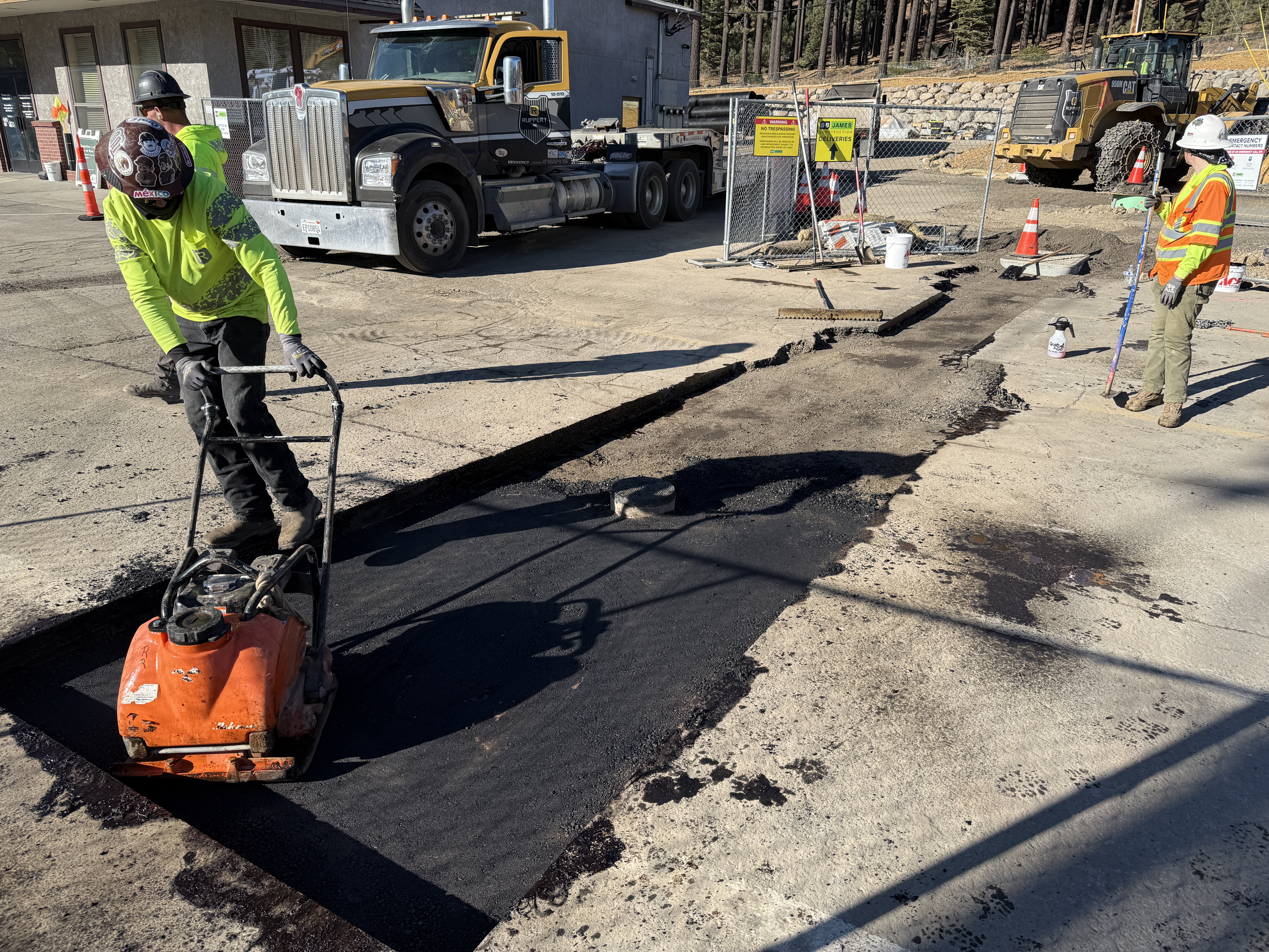 Workers are conducting surface restoration work, compacting asphalt on Trenched areas with a plate compactor. The site is in the mid-construction phase with ongoing asphalt resurfacing on a previously excavated trench. The area is well-defined with traffic cones and safety barriers indicating active construction work.