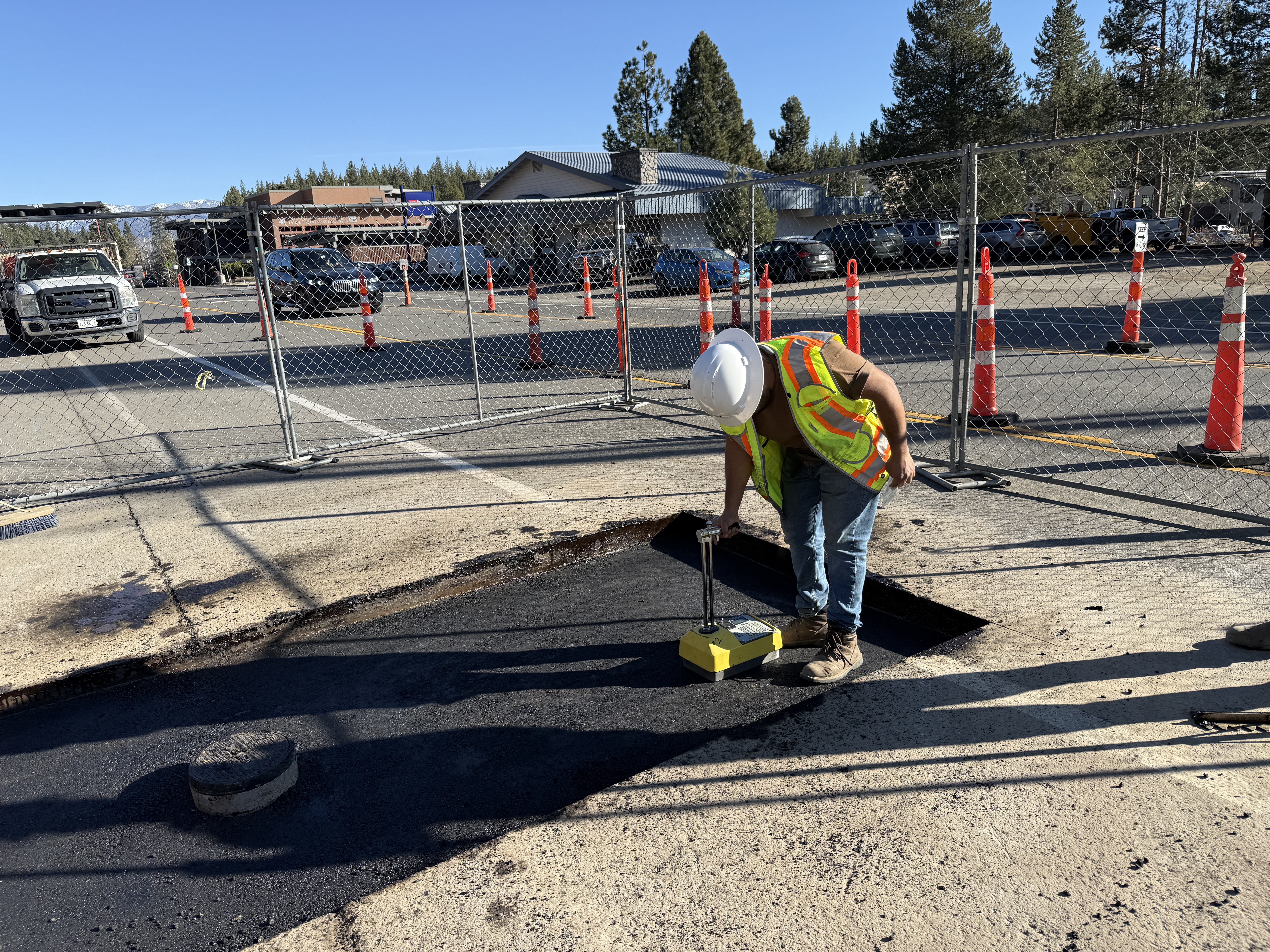 A construction worker is using a nuclear moisture-density gauge to test the compaction of asphalt pavement. The recently laid asphalt appears to be in the curing process, indicating surface-restoration work. The area is secured with temporary fencing and traffic cones, emphasizing the ongoing nature of the construction activity.