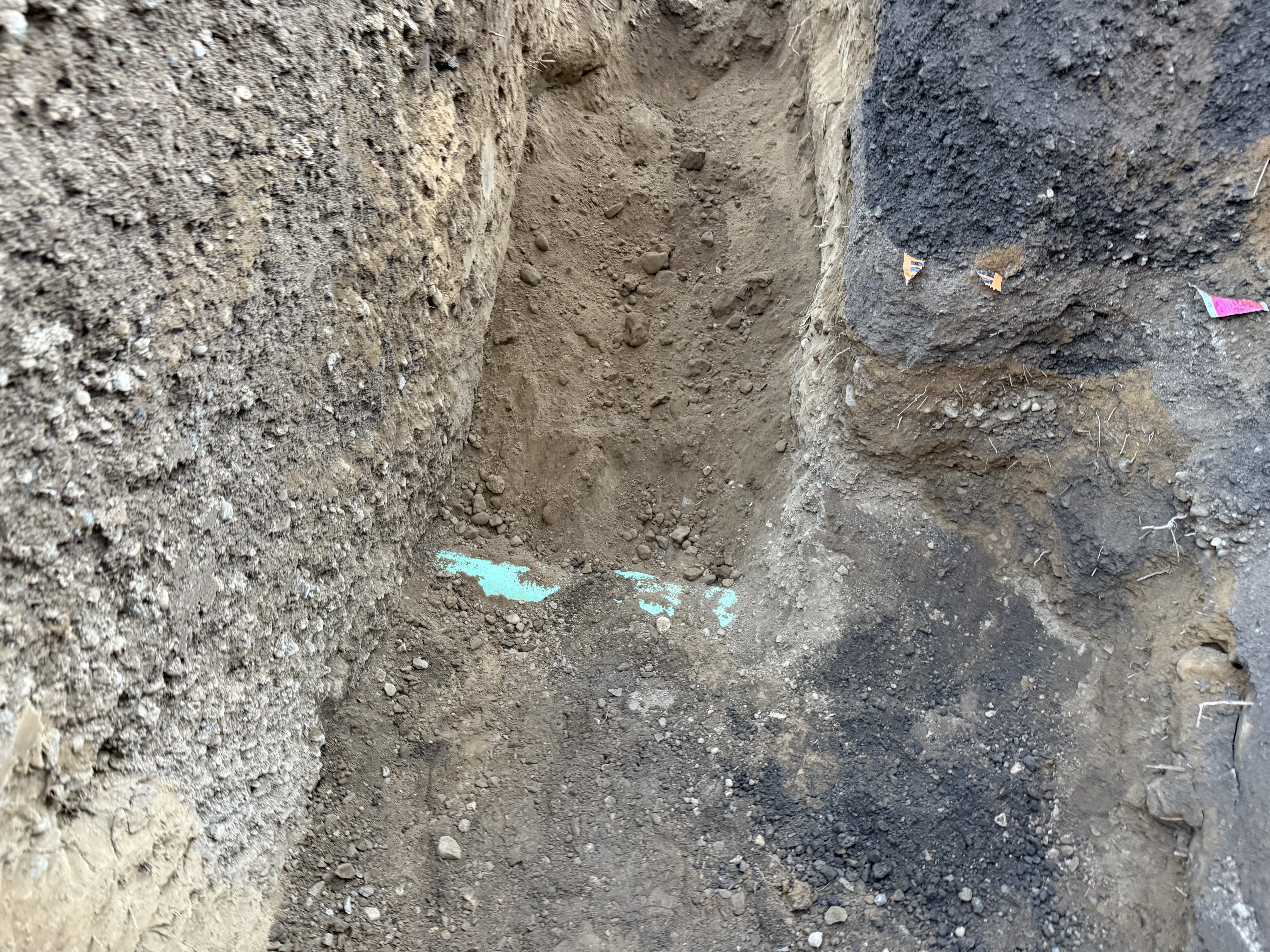 The image shows a partially excavated trench with visible soil stratification. A section of exposed turquoise-colored pipe material is visible at the bottom of the trench, indicating ongoing underground utility installations. The trench exhibits clear soil layering, and there is evidence of site marking flags on the trench walls.