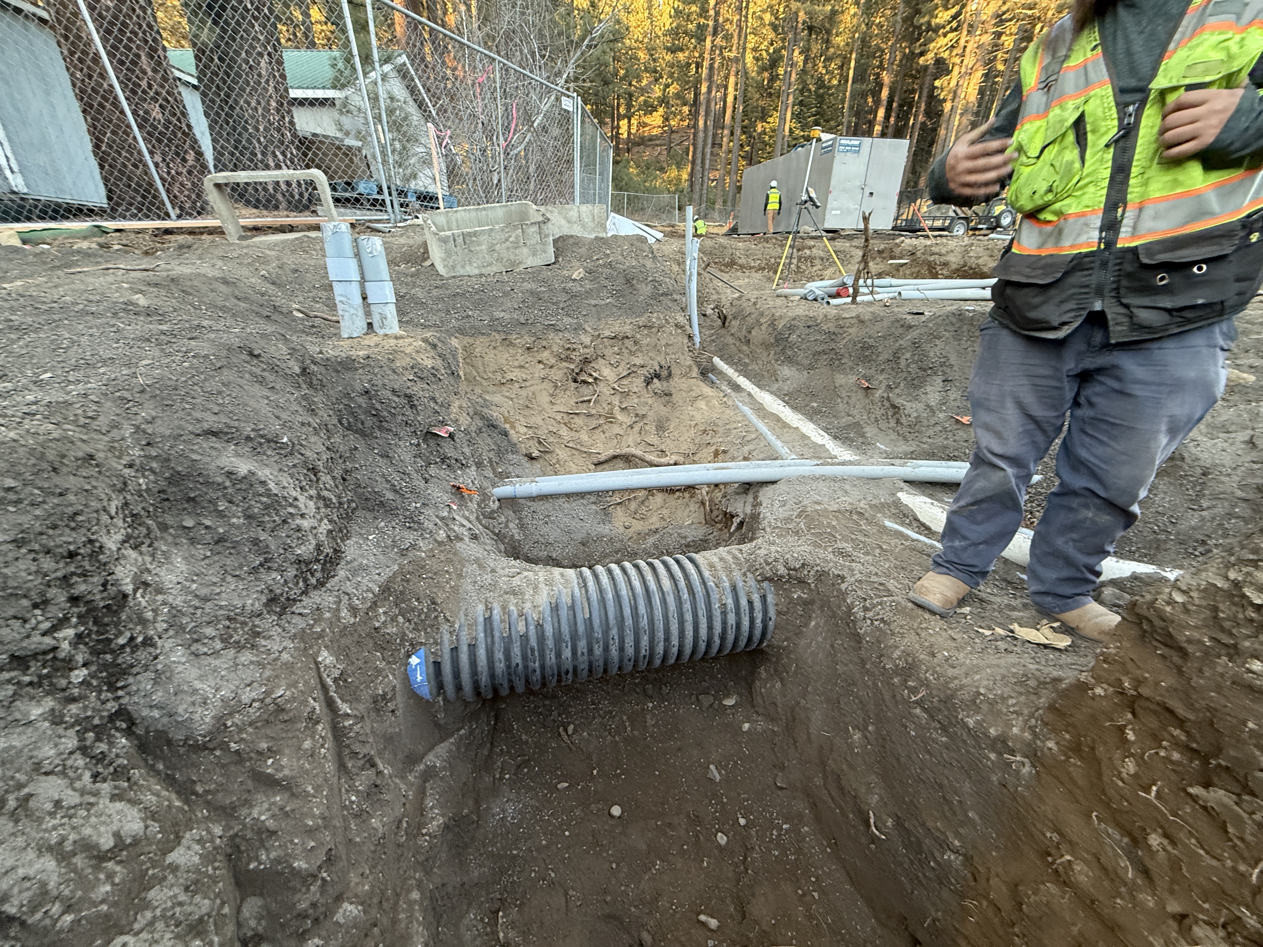 The image shows an active trench excavation with a large corrugated black pipe partially installed, indicating ongoing underground utility work. A worker wearing a safety vest and boots stands next to the trench, suggesting monitoring or inspection activities. Several electrical conduits and white line markings are visible, indicating planned routing for utility lines. The construction phase appears to be mid-stage, with ongoing pipe laying and further site preparations.