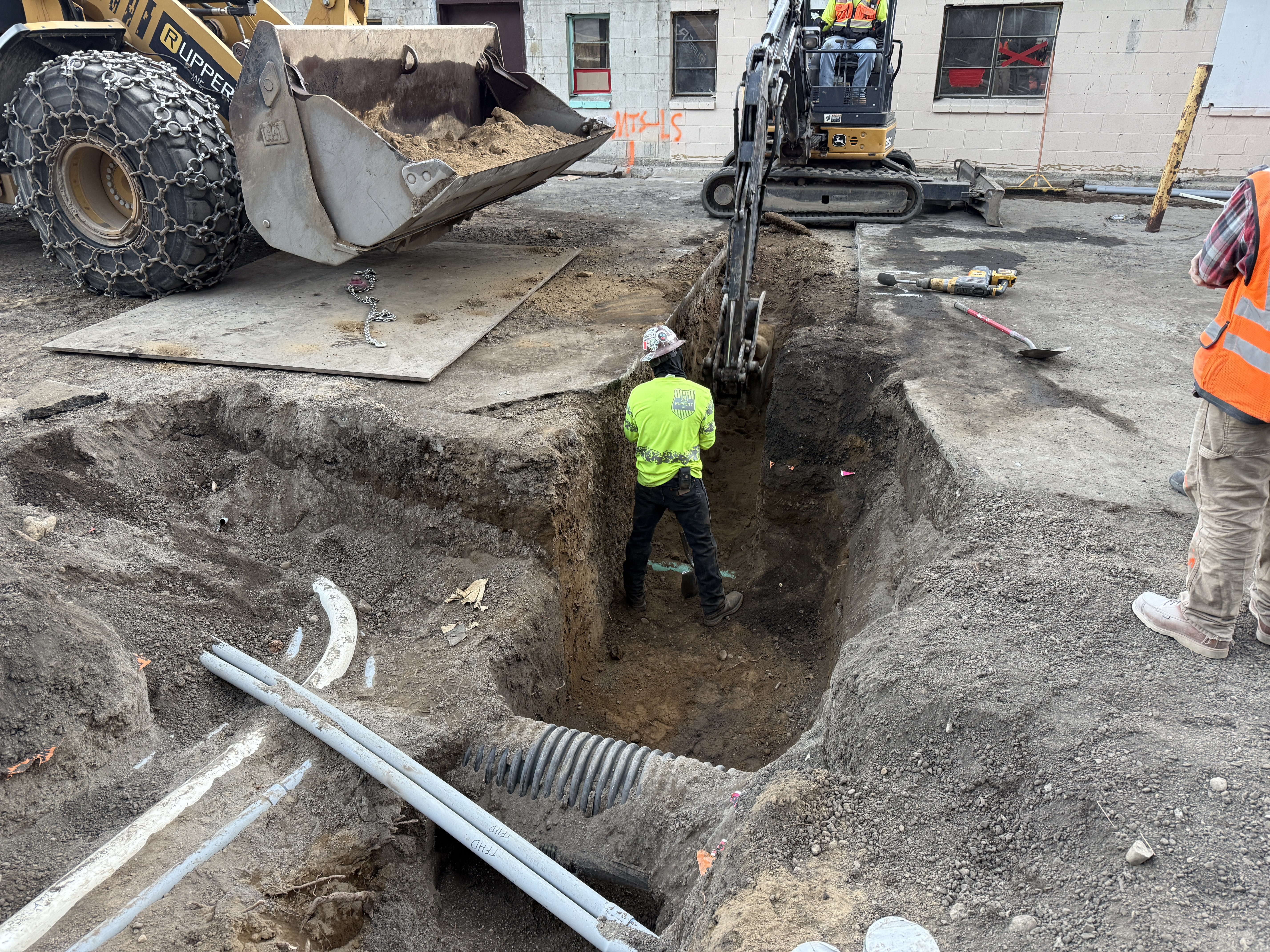 The photo shows a construction site where a worker is in a trench, guiding the bucket of a mini excavator to excavate soil. There are utility pipes, likely for drainage, visible in the trench. The stage appears to be excavation and preparation for further pipeline installation. The site is active, with several workers present who are monitoring the progress.