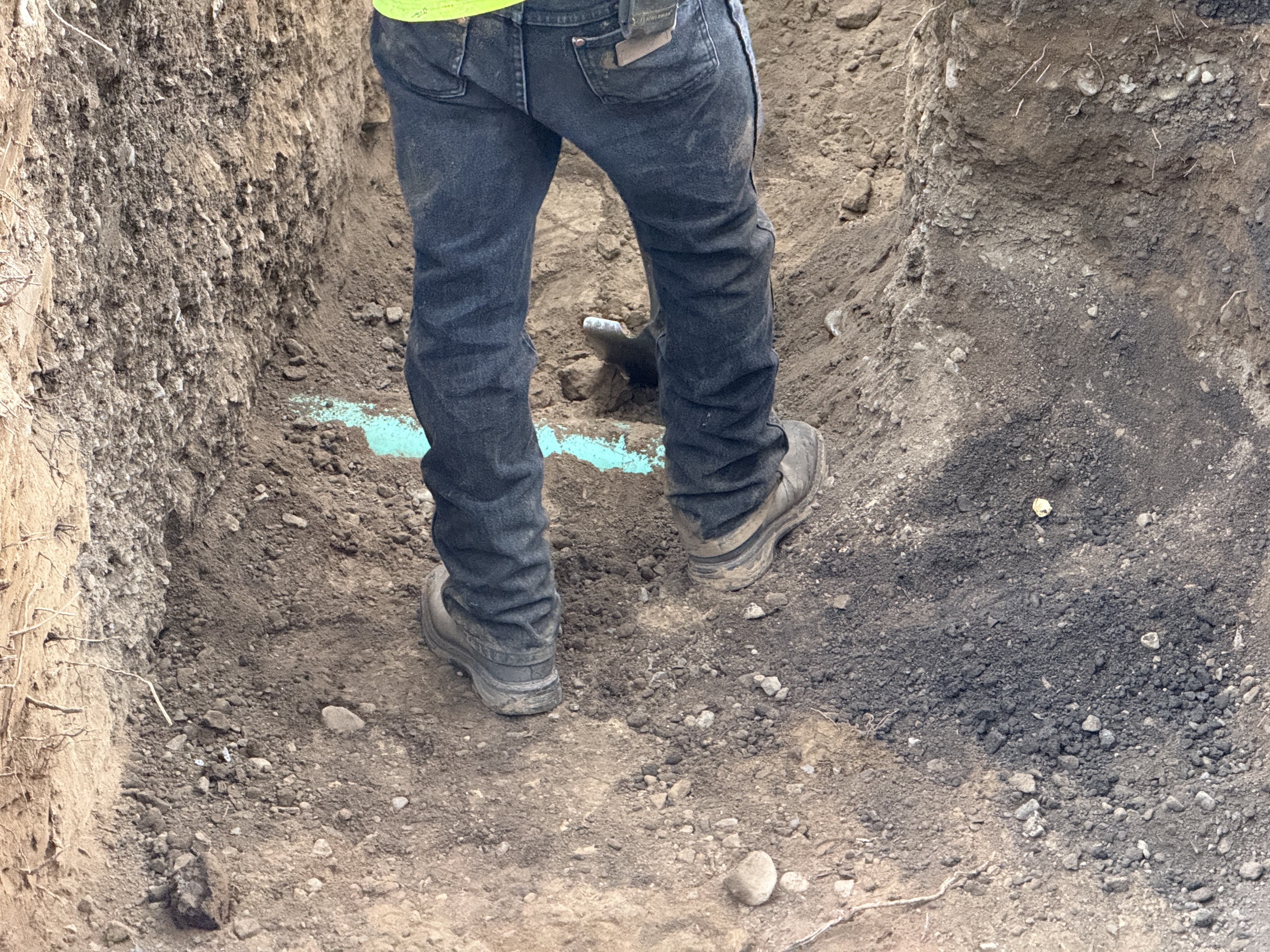 The photo shows an individual standing in an excavated trench inspecting a visible section of water pipeline marked with blue paint, indicating active pipeline installation work. The trench walls are well defined, suggesting precise excavation work, with some soil and small rocks visible at the bottom. The pipeline appears to be groundwork for water utilities in an underground infrastructure project.