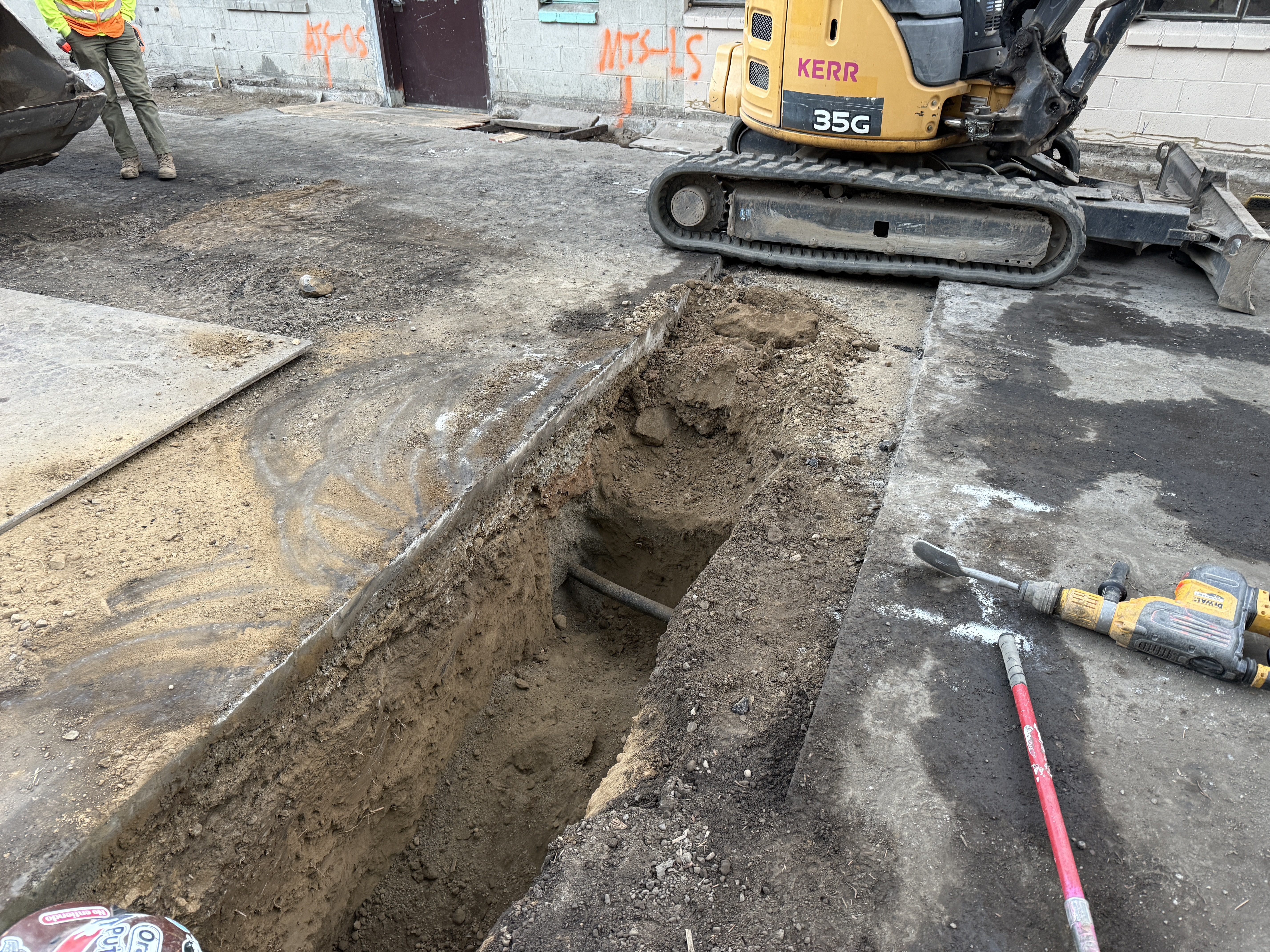 The image shows an active construction site with trench excavation underway. A small excavator is positioned next to a partially dug trench revealing soil layers and a piece of buried conduit. Various tools like a rotary hammer and a shovel are present, suggesting utility installation work. The site appears to be in the early to mid-construction phase for underground utilities.