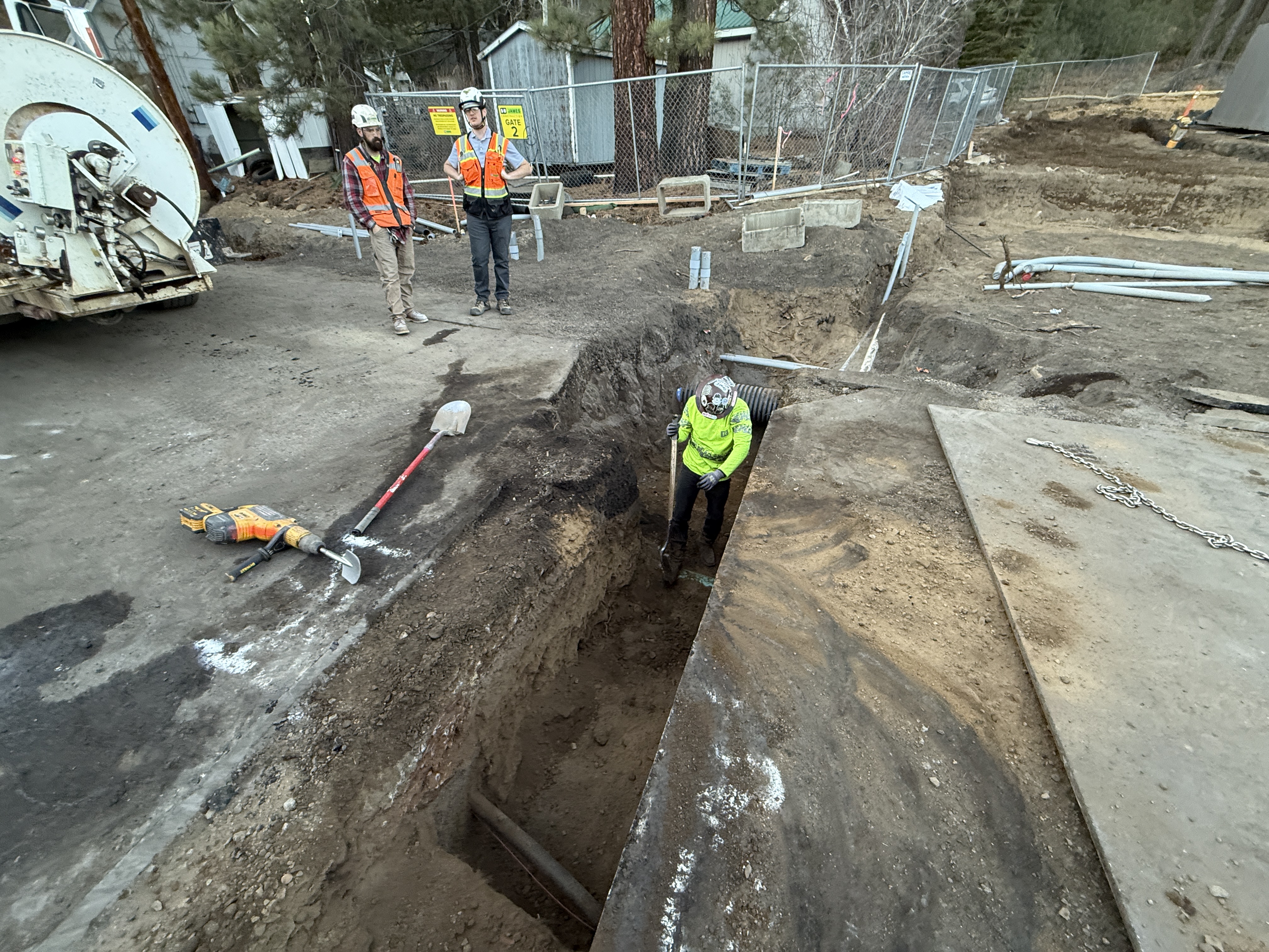 The photo shows a construction worker in a trench engaged in manual digging while two other workers observe from the edge. A concrete mixer truck is partially visible at the left, and tools are laid out near the excavation site. The trench appears to be for utility installation, suggesting early phase trenching activities.