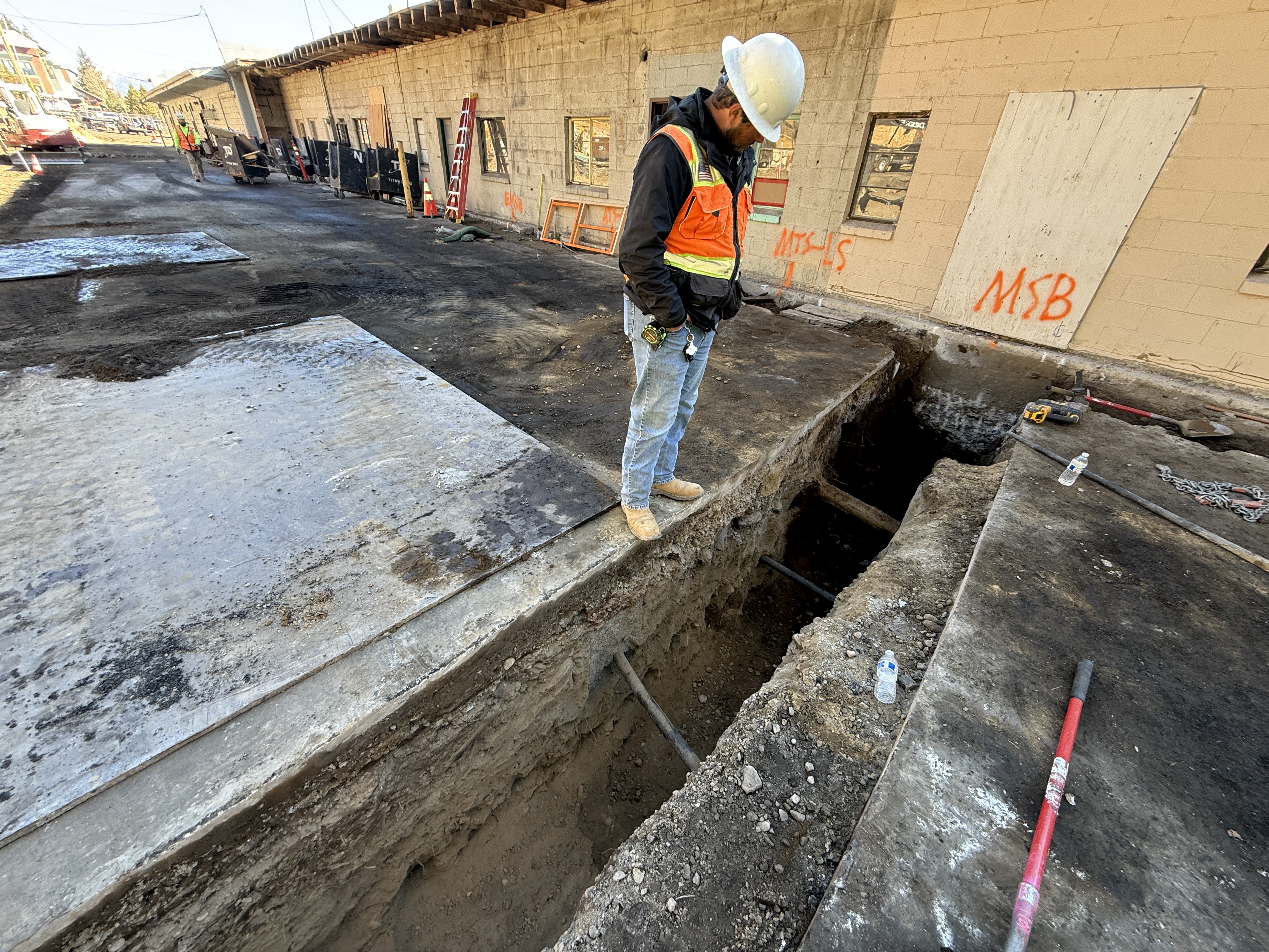 An individual in a hard hat and safety vest is inspecting an open trench near an existing building structure. The trench appears to be part of conduit or piping work, with visible sections of exposed metal pipes and partially covered segments indicating early infrastructure installation stages. Various hand tools are scattered on the ground surface beside the trench, suggesting active construction work.