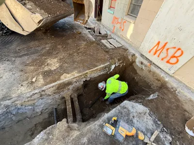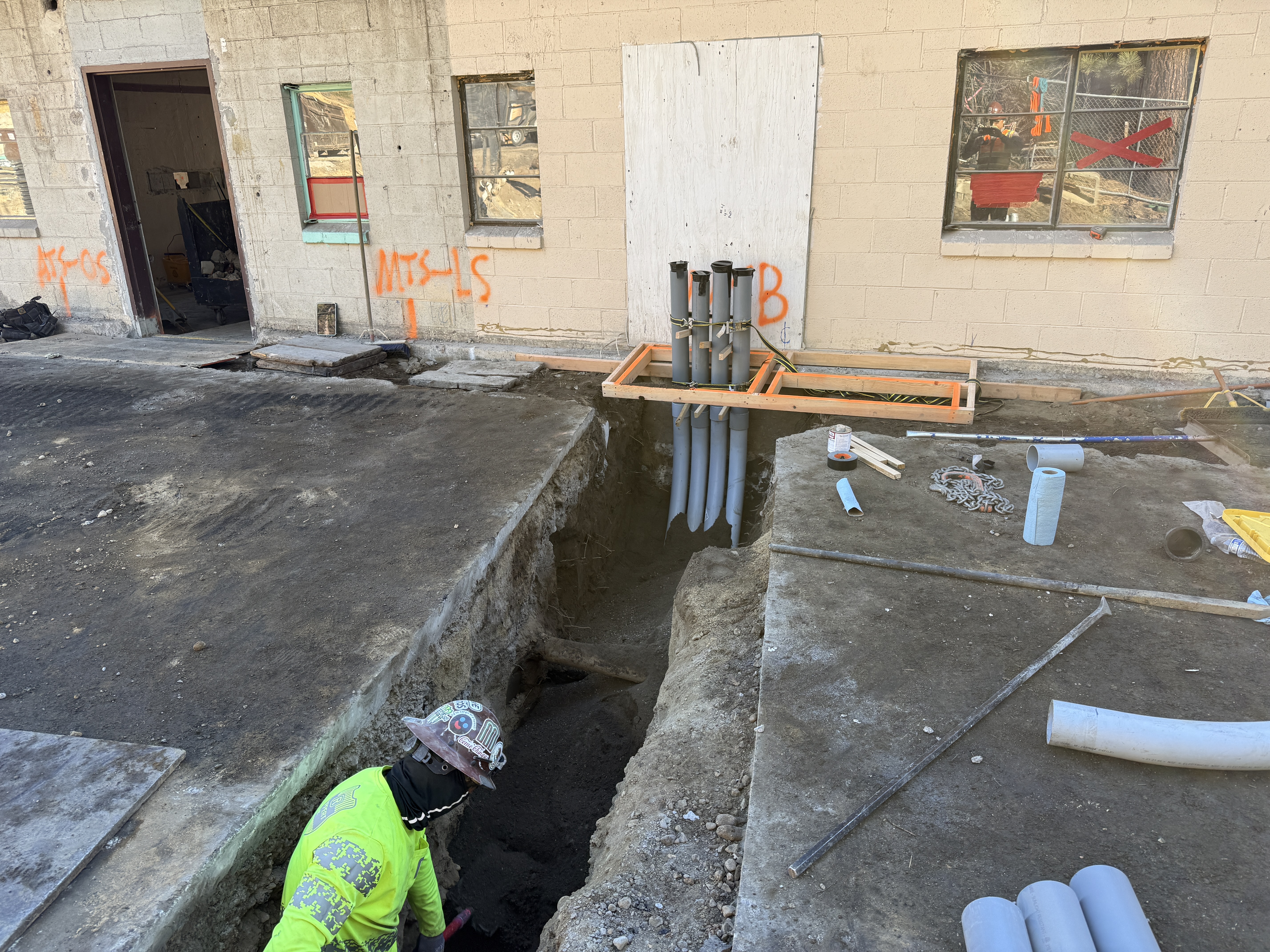 The image shows a work area with trenching activities in progress, where multiple PVC conduits are being installed and configured against a building wall. The workers are likely preparing for electrical conduit installation, as indicated by the presence of conduits and associated materials. The site is in the excavation stage with visible soil exposure, and the building wall appears to be marked with construction annotations.
