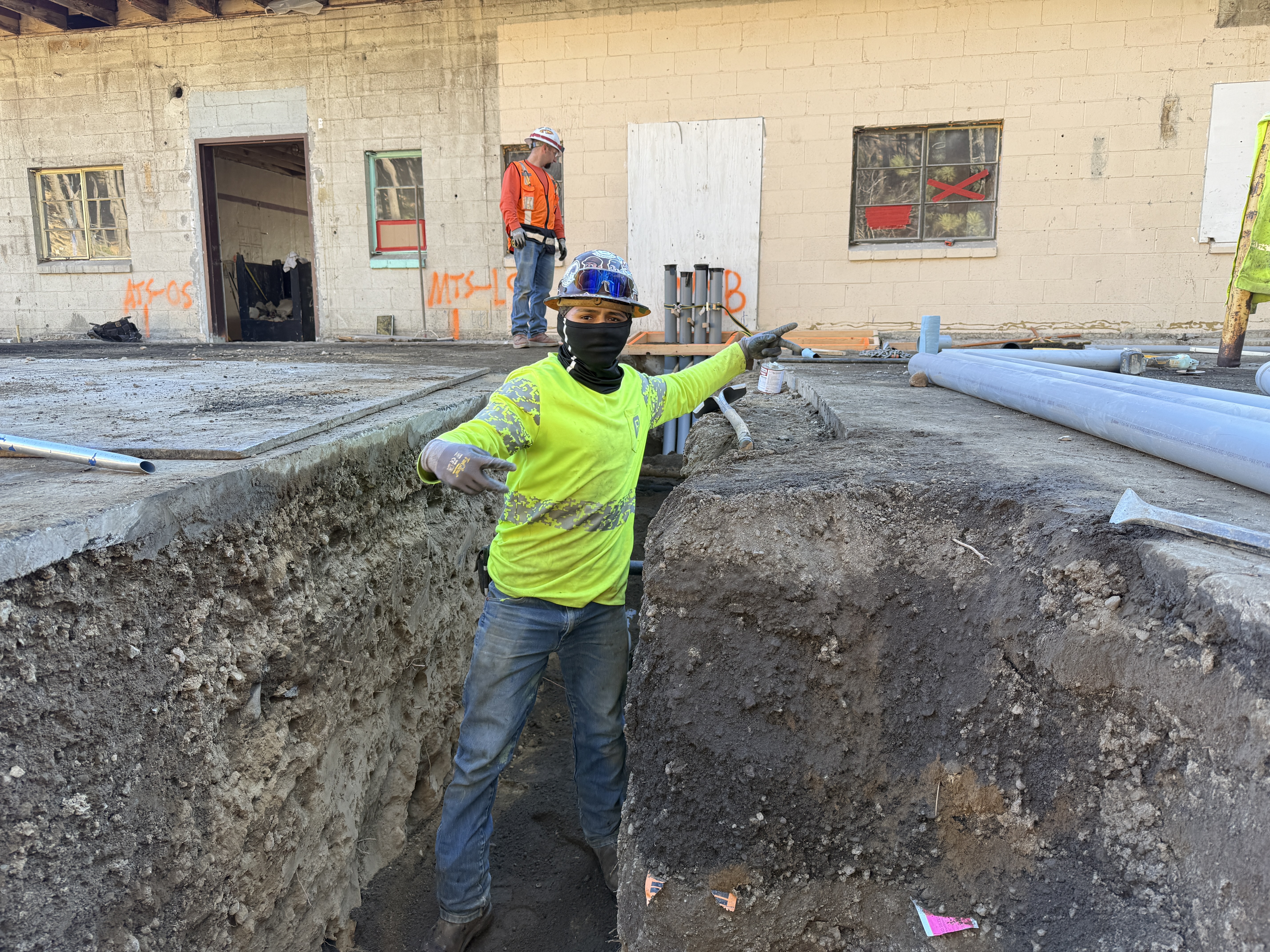 The photo shows a trench excavation in progress with a construction worker standing inside the trench gesturing towards the side. PVC pipes are visible on the ground, indicating the preparation for pipeline installation. The building in the background has markings on the wall, typical of utility work initial stages, and other workers are present on site.