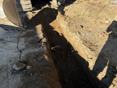 A worker is compacting soil in a trench using a vibratory plate compactor, indicative of backfill and compaction activities. PVC pipes, likely intended for utility installation, are staged nearby, suggesting ongoing pipeline work. A skid steer loader with a filled bucket is positioned at the trench edge, possibly used for excavation or backfill. The site appears to be in the mid-phase of underground utility construction, with materials actively being utilized and staged.