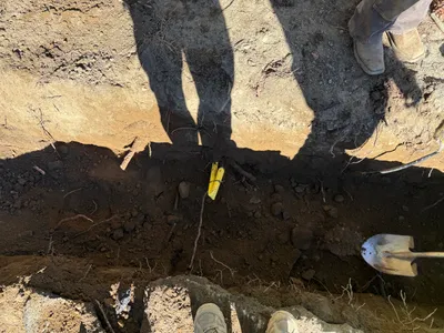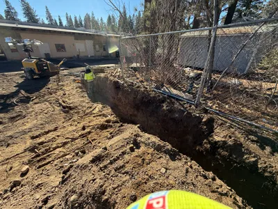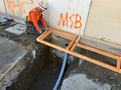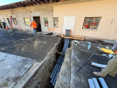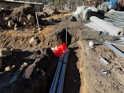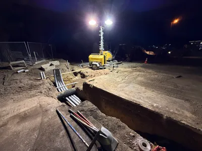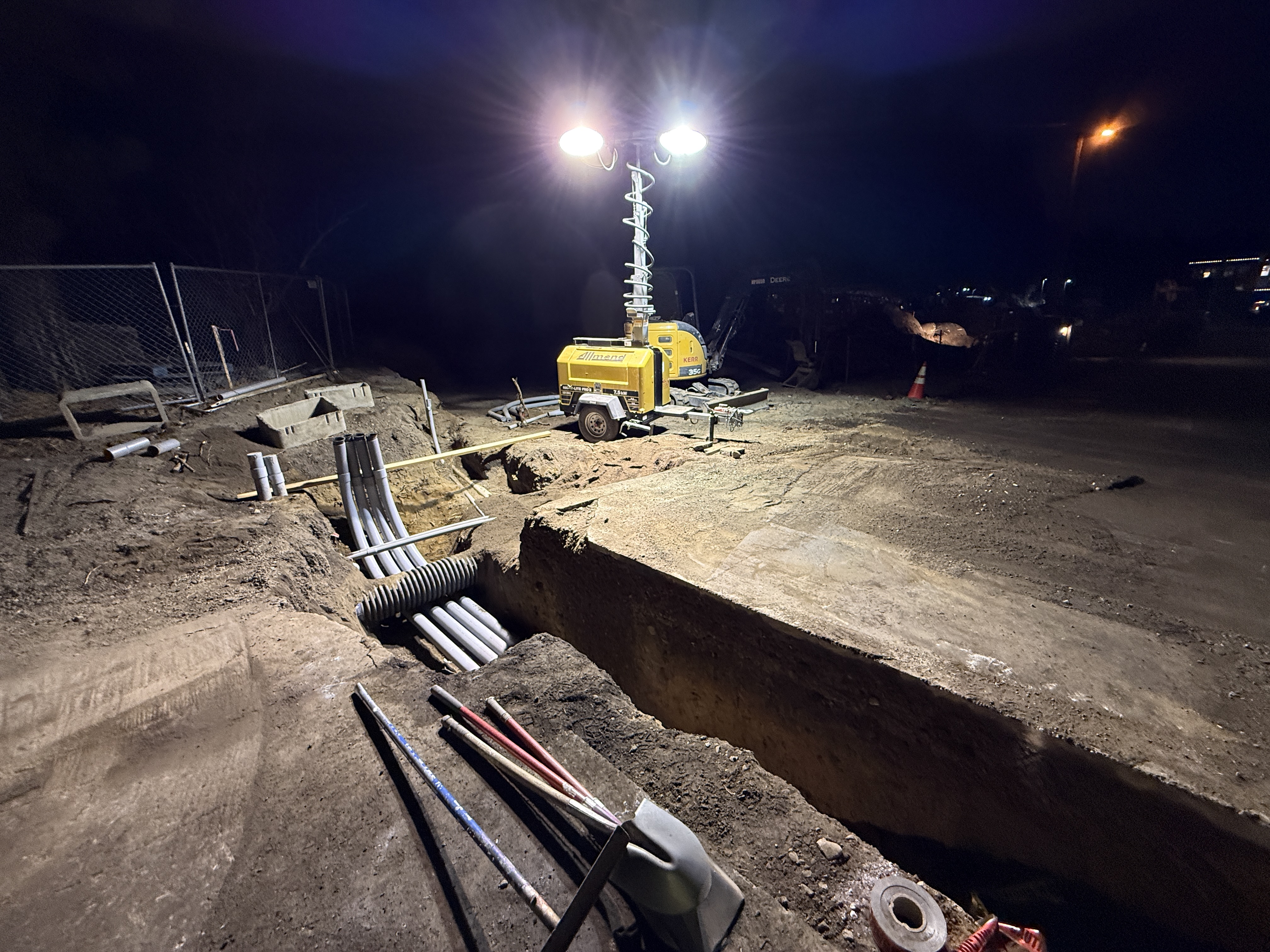 The image depicts a nighttime construction scene with ongoing trench excavation for utility installations. Multiple PVC pipes of various diameters are laid within the trench, prepared for connection. A portable light tower is in use to illuminate the work area, suggesting night work at this stage of the project.