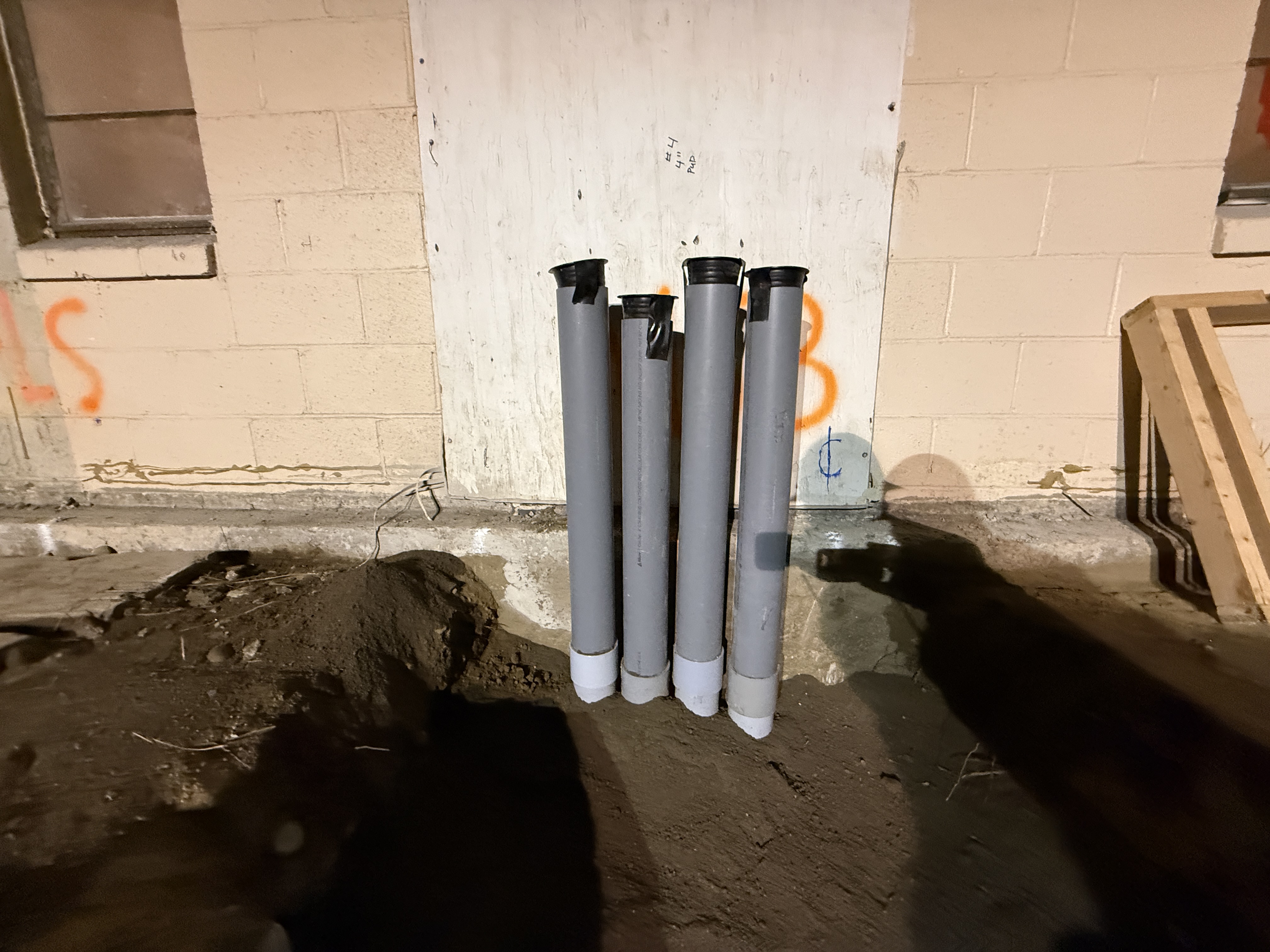 The image shows four PVC pipes with caps leaning against a wooden barrier, suggesting preparatory work for a pipeline installation. The ground is partially excavated, indicating early stages of utility work in a dirt excavation site. The pipes appear staged for future installation, with some construction marking visible on the wall.