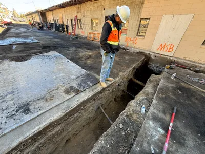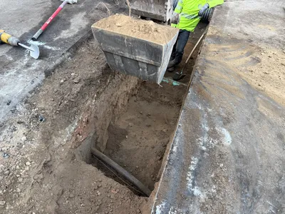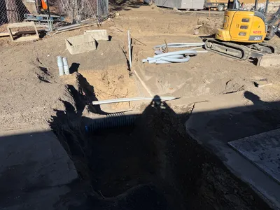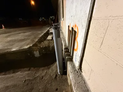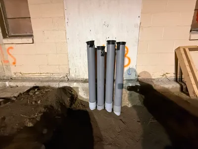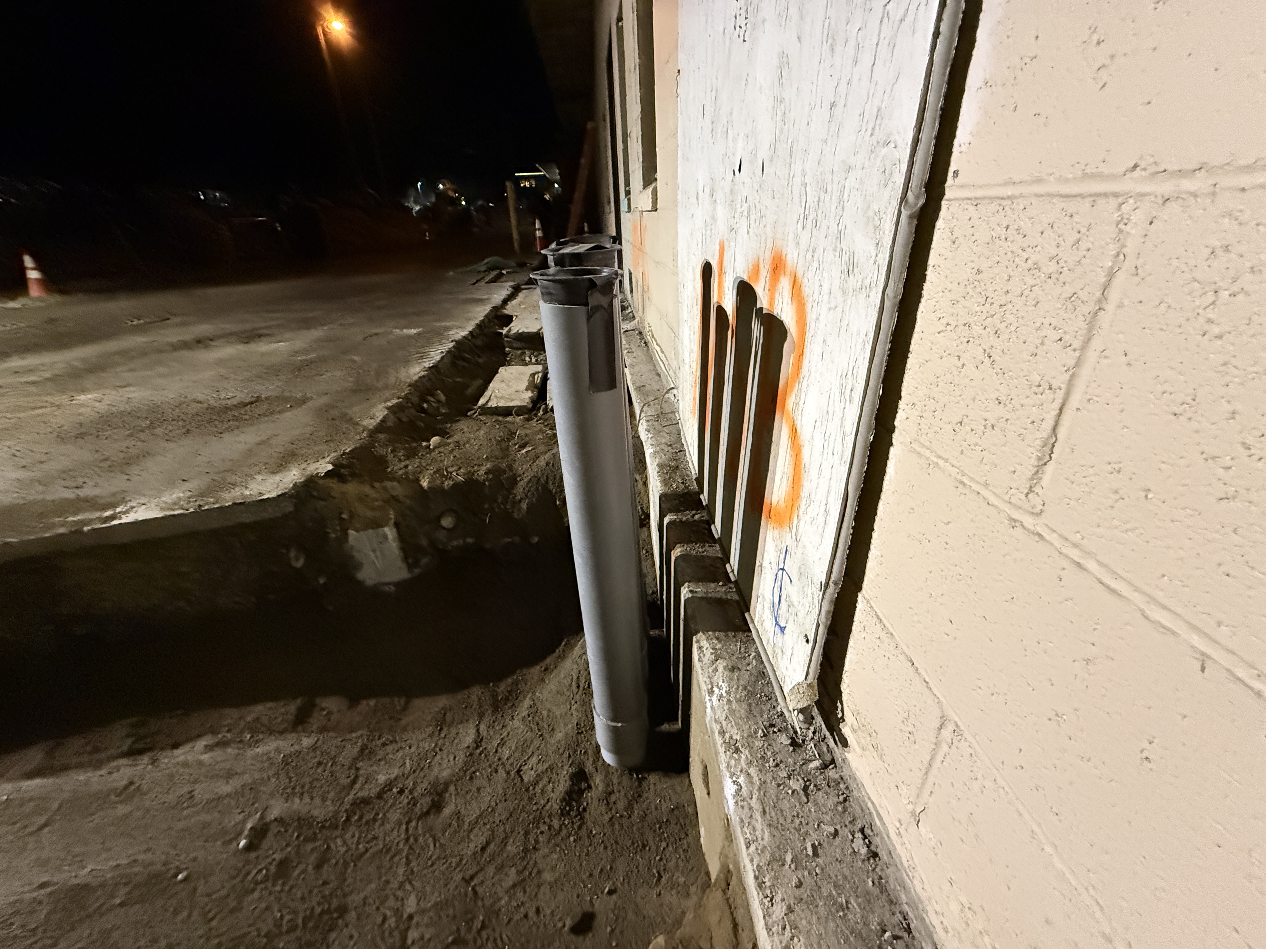 The image shows a construction site at nighttime with a focus on a trench and partially installed piping system alongside a building. Several vertical PVC pipes are aligned next to a concrete block which appears to be part of a foundation or footing. The area is prepared for further pipe installation, as indicated by the open trench and staged materials.