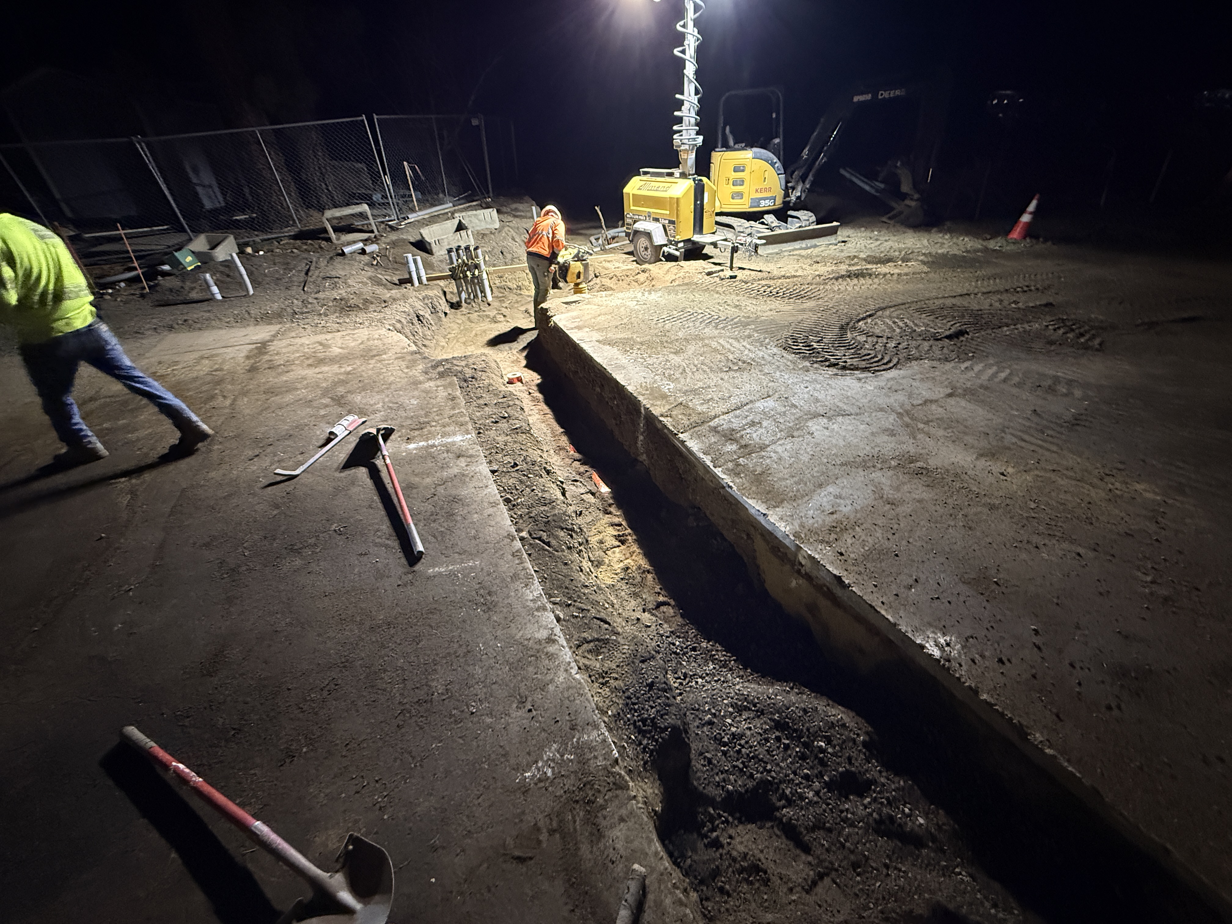 The photo shows night-time construction work on a water infrastructure project in progress. A trench is being excavated adjacent to a concrete slab, likely for utility installation. A mobile light tower is in use to illuminate the site, and hand tools are scattered on the ground. Two workers are present, with one actively engaged near the trench and the light tower.