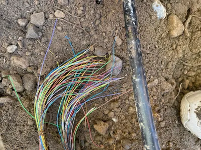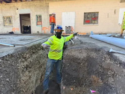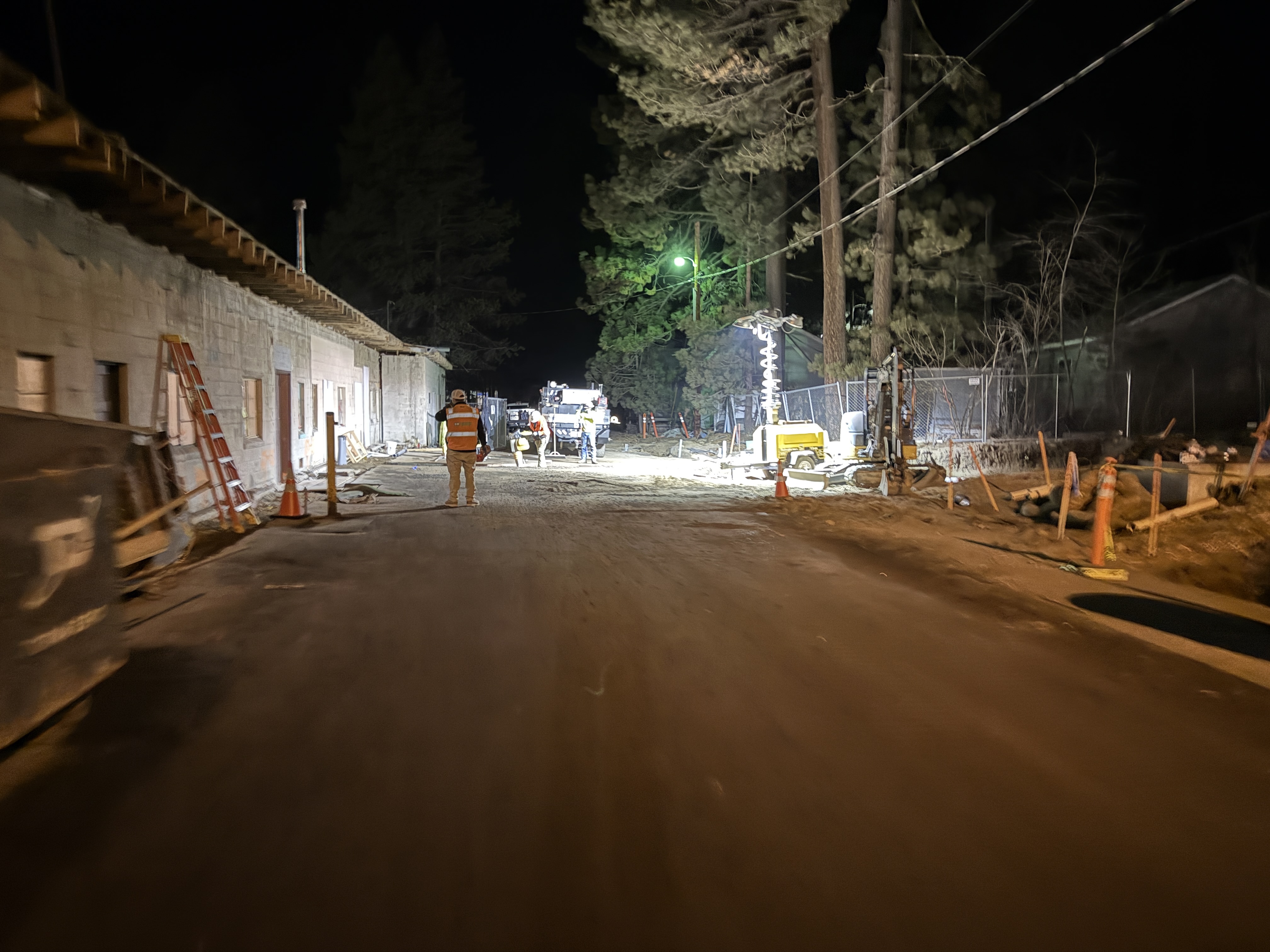 The image depicts an active nighttime construction site with workers performing utility work. A worker is visible next to a building under construction, and portable lighting is used to illuminate the work area. Construction cones and barricades are set up alongside materials and equipment.
