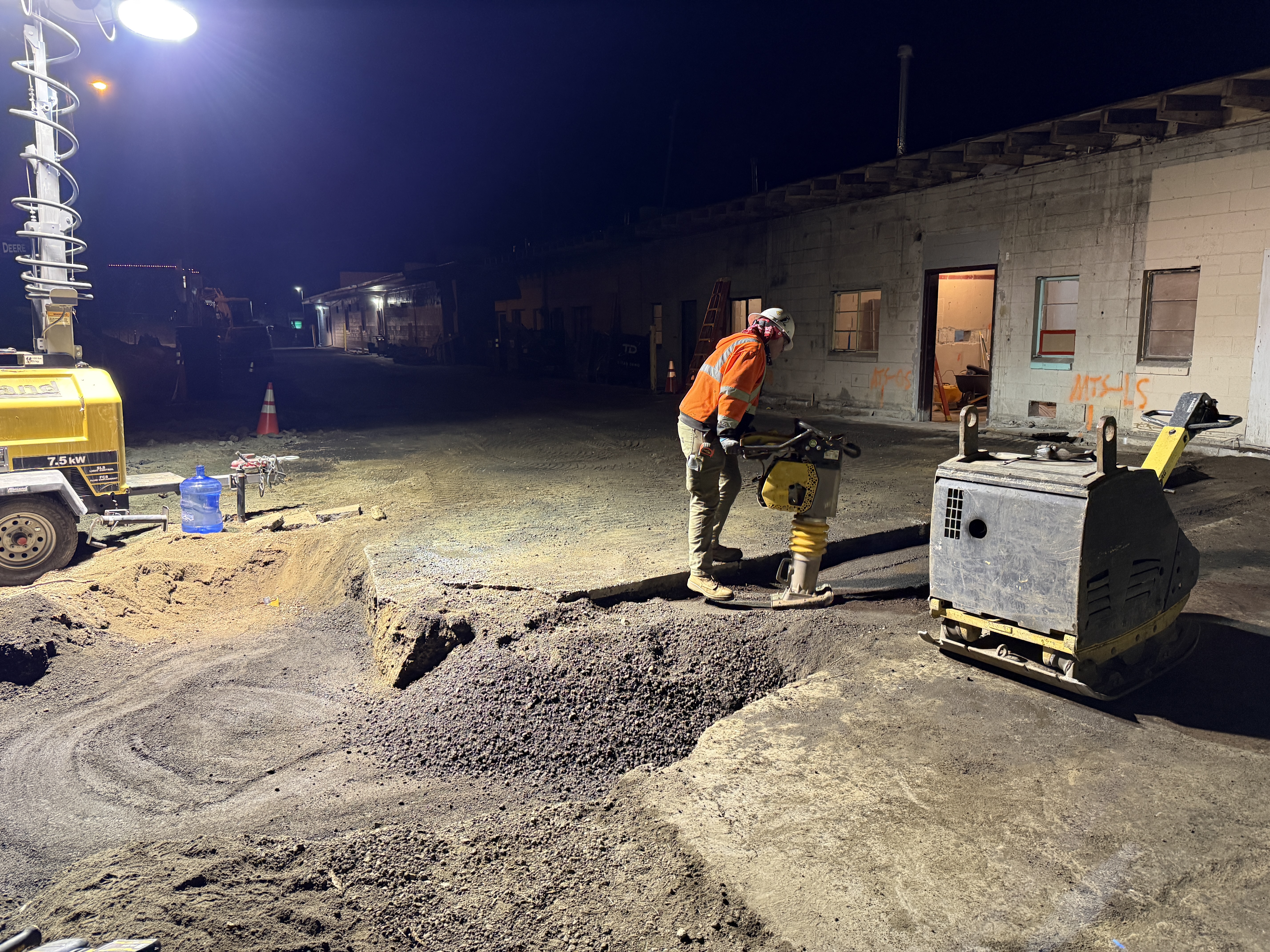 The image shows a construction worker operating a compaction tool in an excavation area during nighttime. The site is illuminated by a portable tower light, and the worker is compacting soil backfill in a trench. Nearby, there's a reversible plate compactor and a generator powering the light source.