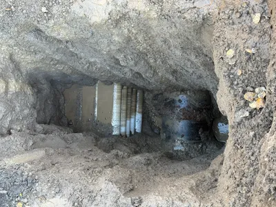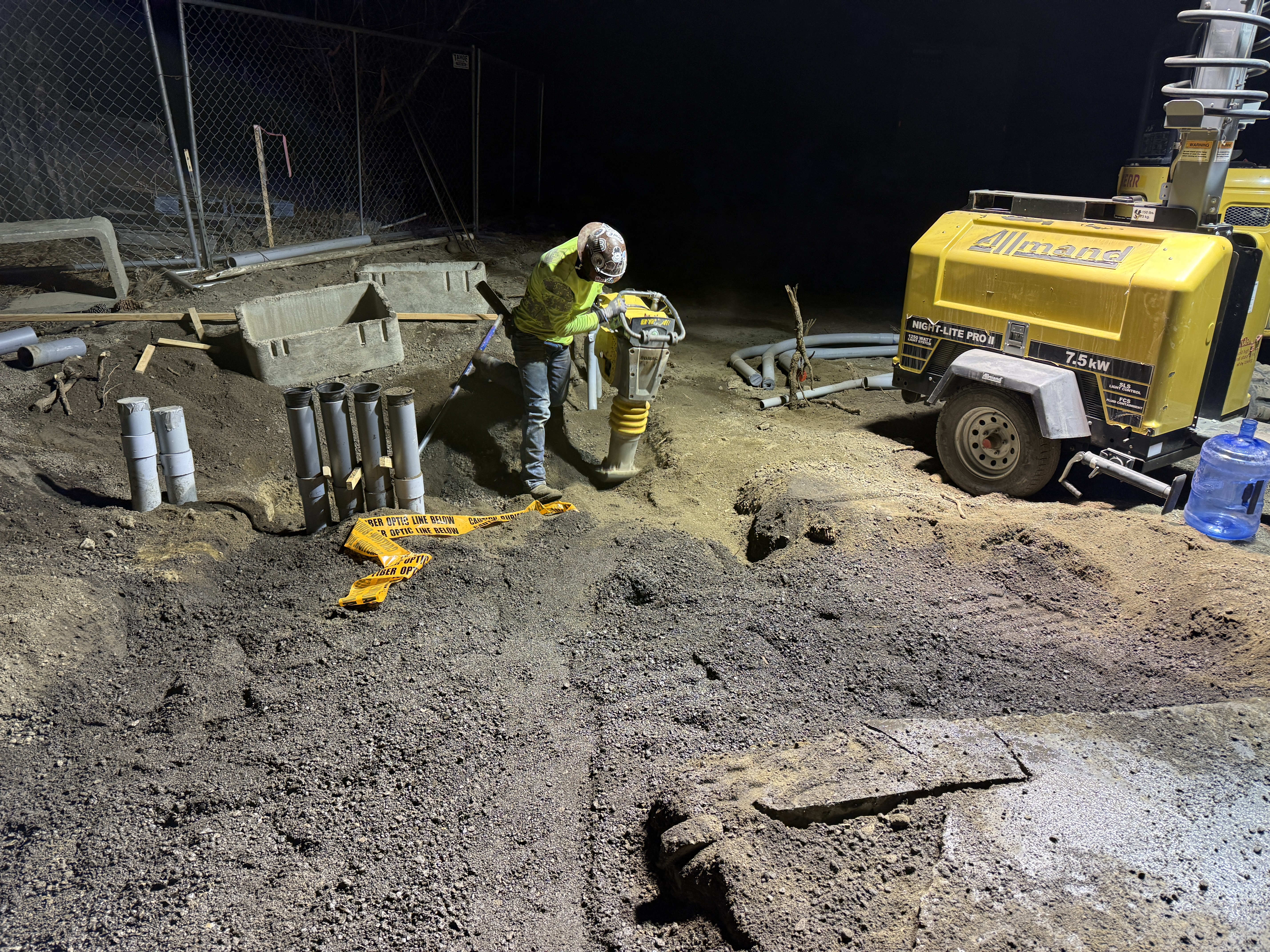 A worker is using a compactor to consolidate soil in a trench area as part of underground utility work. Several PVC pipes are staged vertically, indicating preparation for pipeline installation. A portable light tower and generator provide illumination, suggesting night work. Warning tape is placed around the trench for site safety and area delineation.
