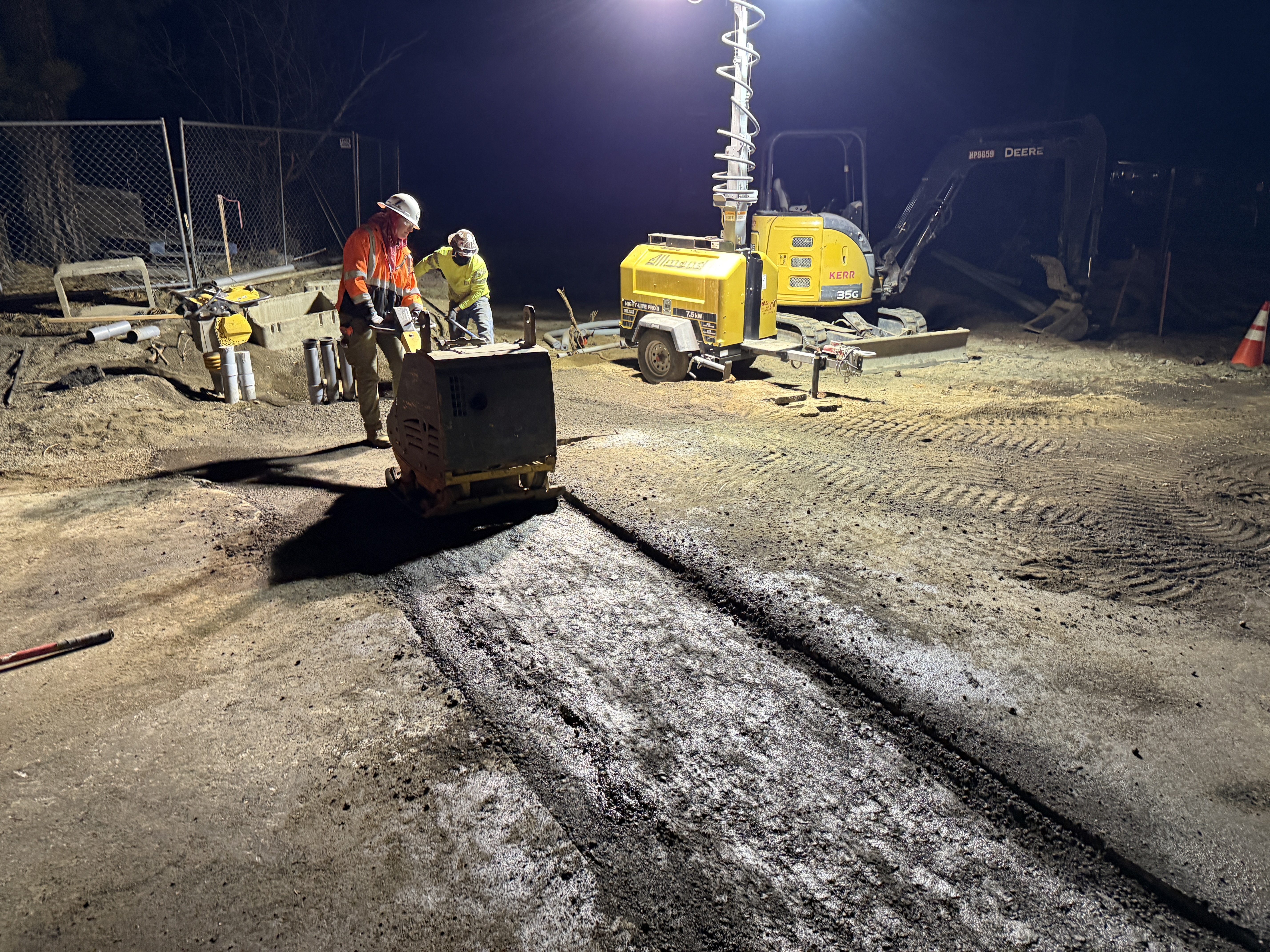 This photo shows nighttime paving operations with workers compacting a newly laid asphalt patch as part of surface restoration. A vibratory plate compactor is being used to achieve proper surface density. An illuminated generator provides necessary lighting, and there is a compact excavator in the background potentially used for initial excavation or backfill tasks.