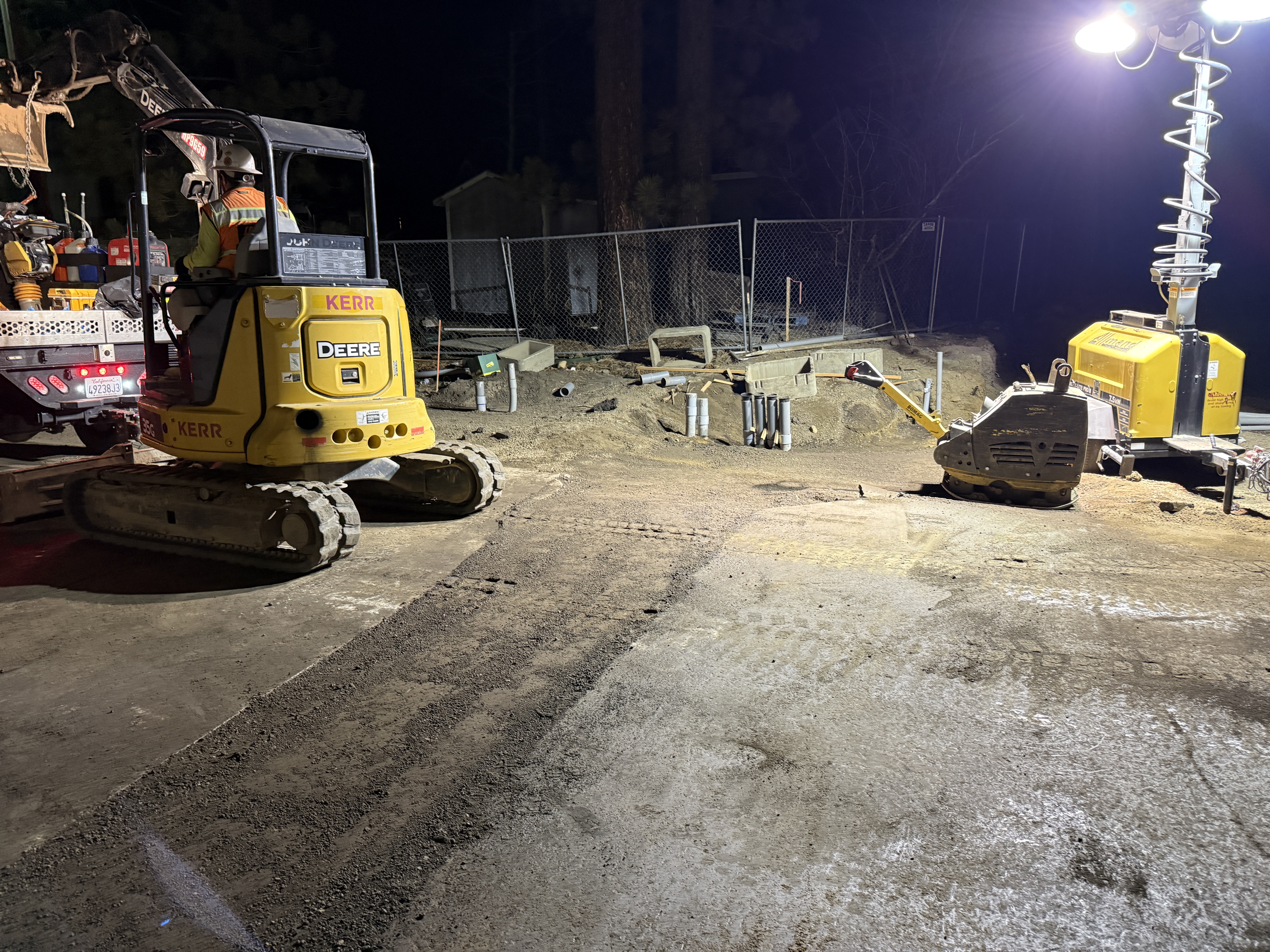 The photo shows a nighttime construction site with an active yellow mini excavator and a portable light tower illuminating the area. There is soil excavation visible alongside several pipes protruding from the ground, indicating early-stage underground utility work likely involving water infrastructure. The ground surface appears partially graded with some equipment moved to the side of the work area.