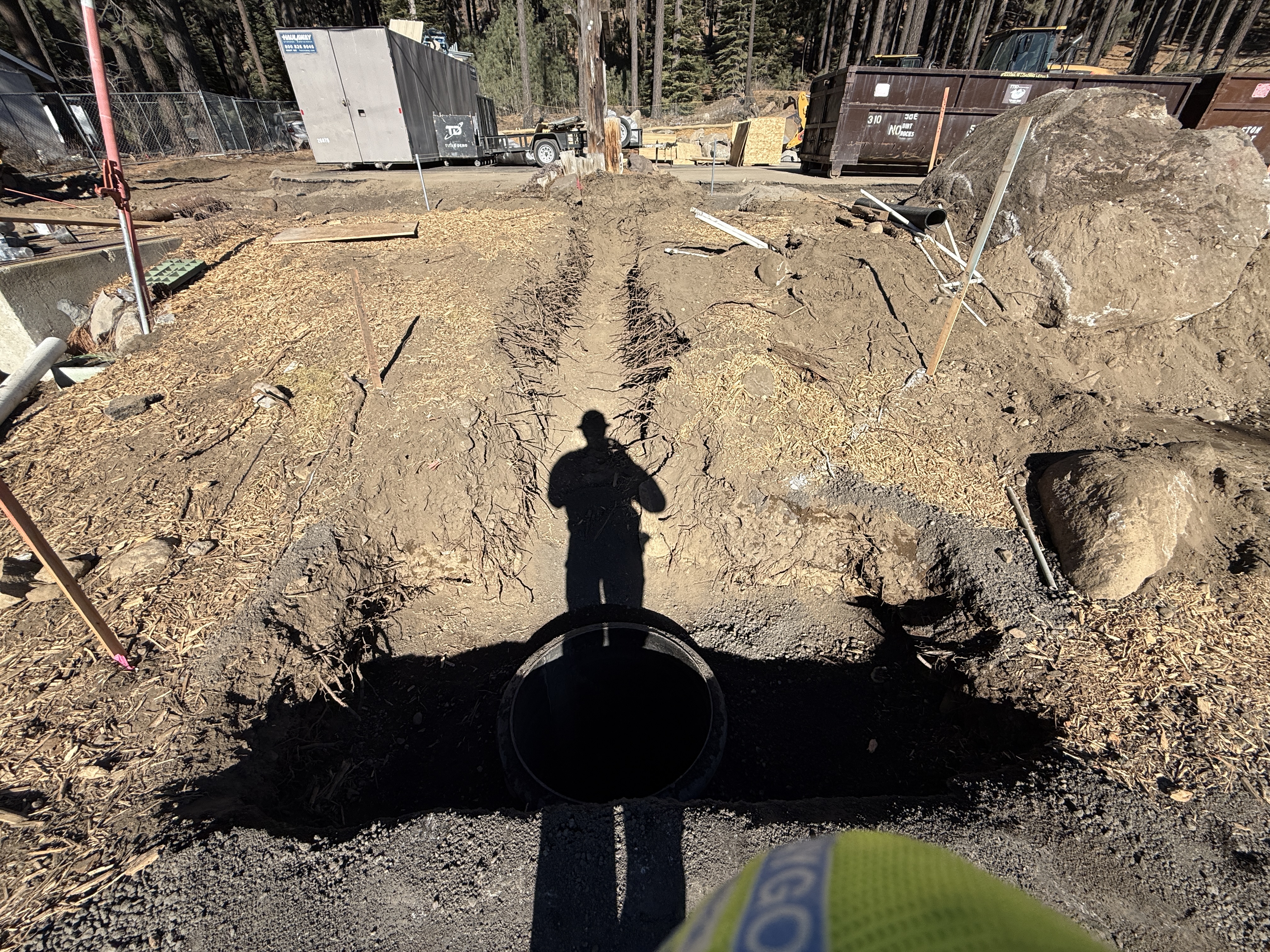 The image shows a construction site with trench excavation in progress for underground utility work. A circular pipe opening is visible at the foreground, indicating ongoing installation. The site is filled with loose soil and mulch, suggesting preparatory or grading activities. There are temporary barriers and fencing, typical for active construction zones where safety measures are in place.
