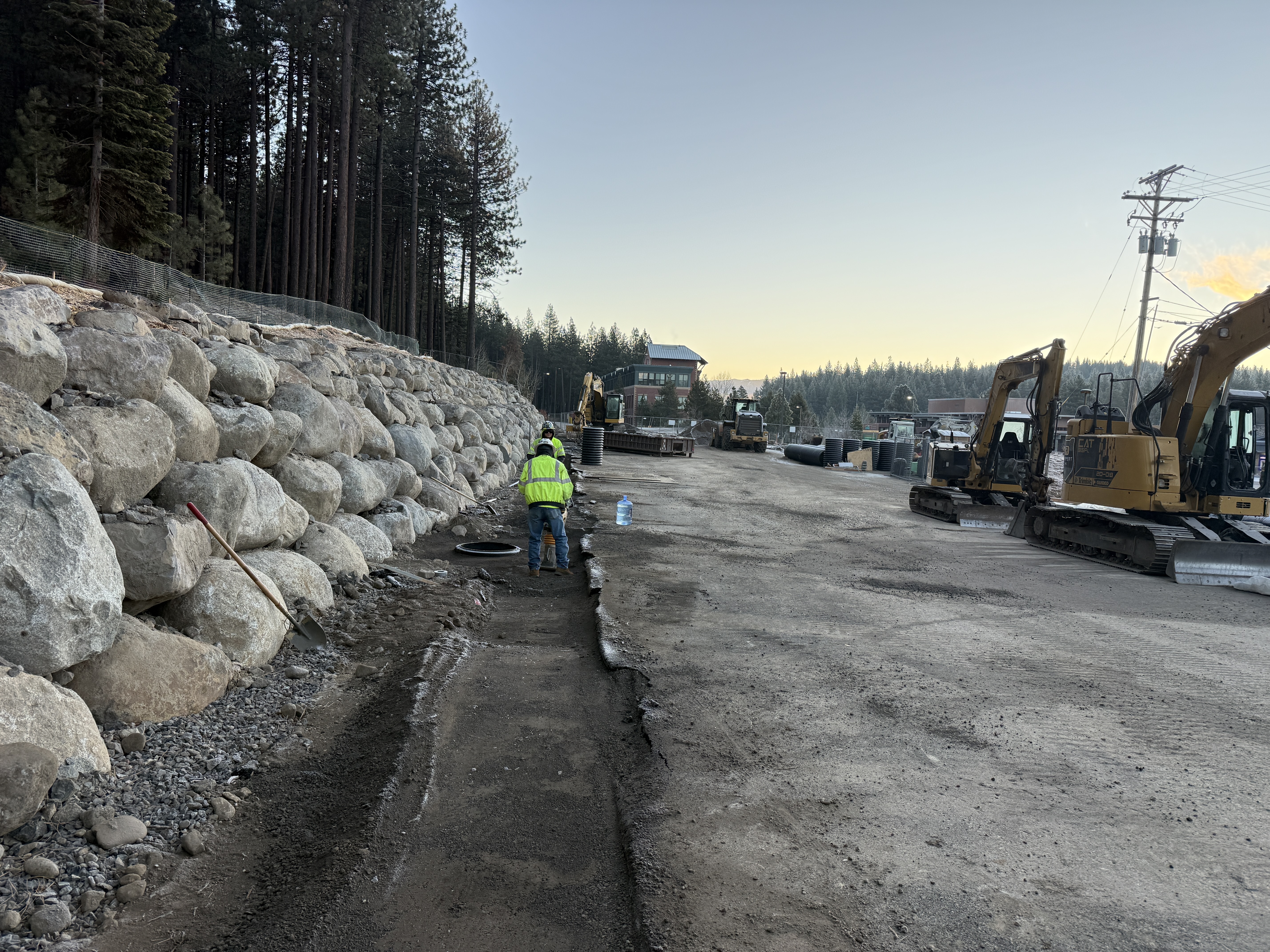 The image shows ongoing excavation work at a construction site featuring a rock retaining wall constructed with large boulders. A worker in a high-visibility vest is managing trenching activities alongside the wall. Heavy earth-moving equipment, including excavators and compactors, are staged on a graded dirt surface. There are signs of utility installation preparation, with pipes and fittings visible on site.