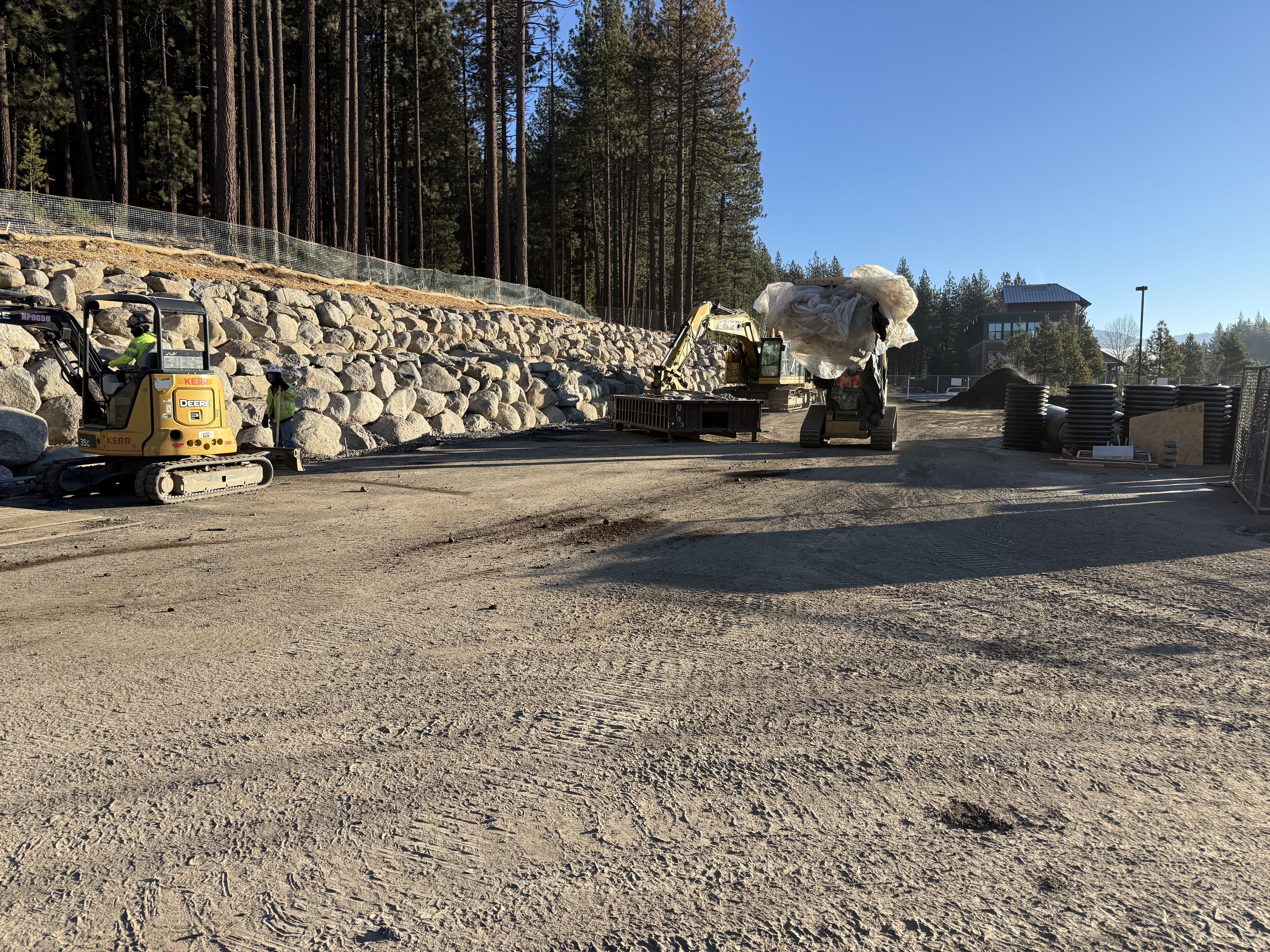 The image shows active site-grading work with a mini excavator on a dirt surface next to a rock retaining wall. A front loader is visible, carrying large wrapped material, likely for erosion control. The site is well-organized with stacked pipes and construction materials staged at the periphery, indicating preliminary stages of utility installation.