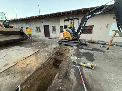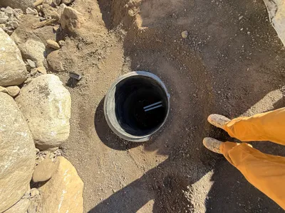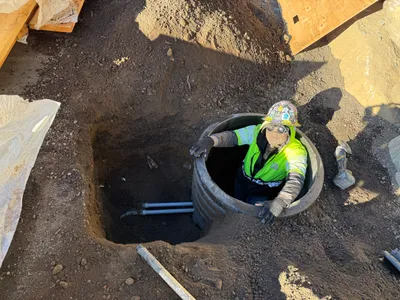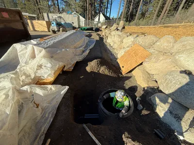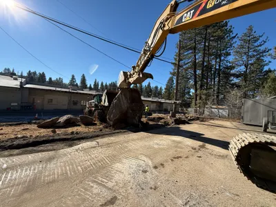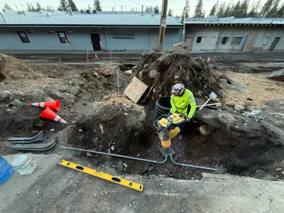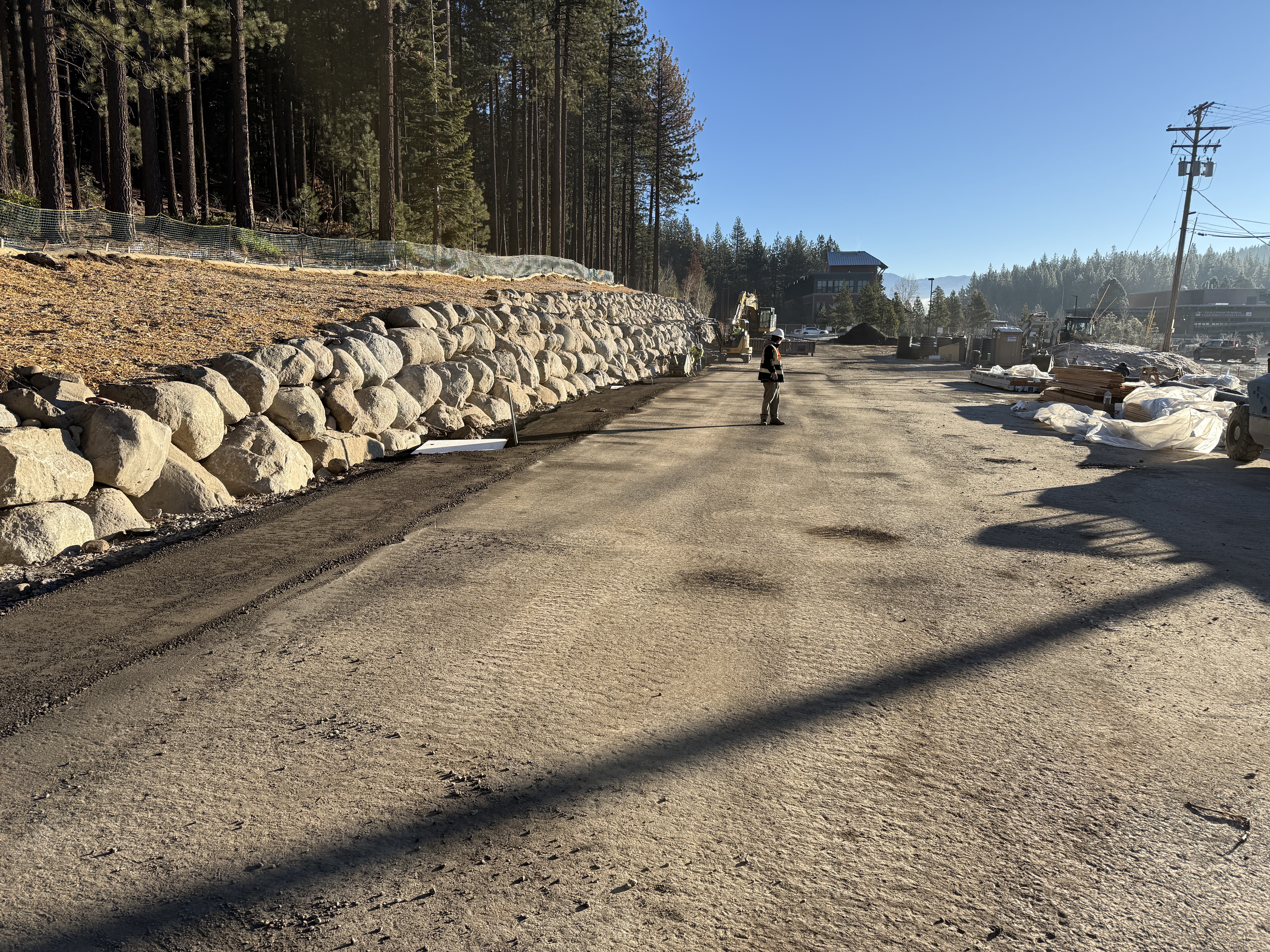 The photo shows a construction site with active grading and preparation work on an access road. A retaining wall made of large stones is visible on the left side of the graded road. Construction materials, such as pallets and covered equipment, are staged on the right. A construction worker is visible in the distance, indicating ongoing operations.