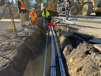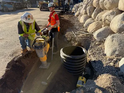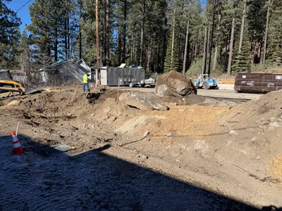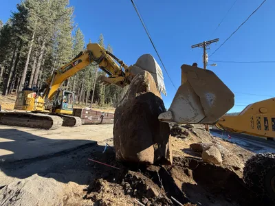 The photo shows a construction site with heavy equipment lifting a large boulder. An excavator is actively engaged in earthwork, utilizing a bucket to move materials. In the background, additional machinery is visible, indicating ongoing preparation and grading activities. Overhead power lines suggest work is being conducted near utility infrastructure.