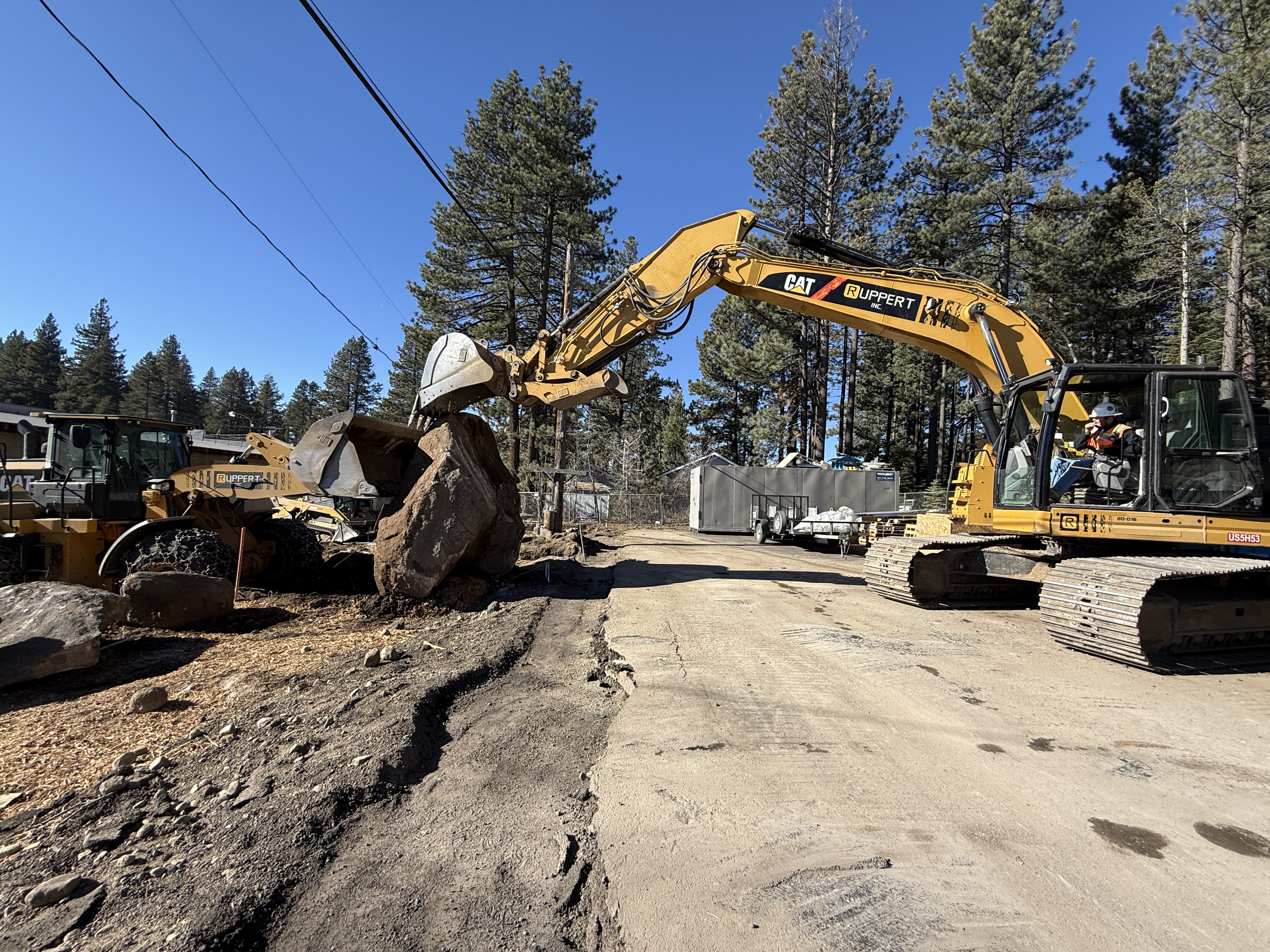 The image shows an active earthmoving operation involving a large Caterpillar excavator lifting a boulder from a roadway. The operation is part of water infrastructure work, likely at the stage of site grading or trench excavation. Surrounding coniferous trees and clear skies suggest an open, forested construction site environment.