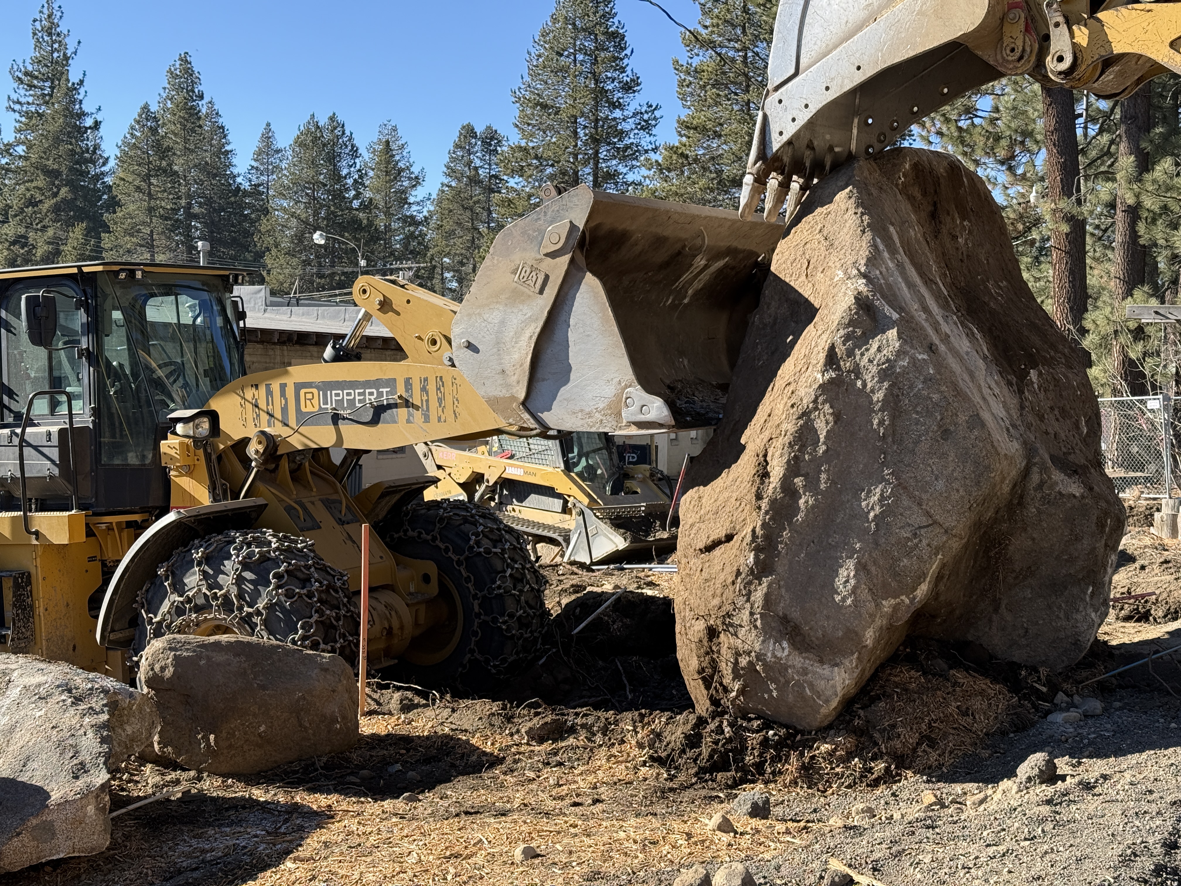 The photo shows an active excavation operation with a large boulder being lifted by a backhoe loader equipped with a bucket. The area appears to be at an early stage of utilities installation, with loose earth and rock being moved to clear the way. The operation is occurring in a forested area, indicating site preparation for infrastructure needs in a natural setting.