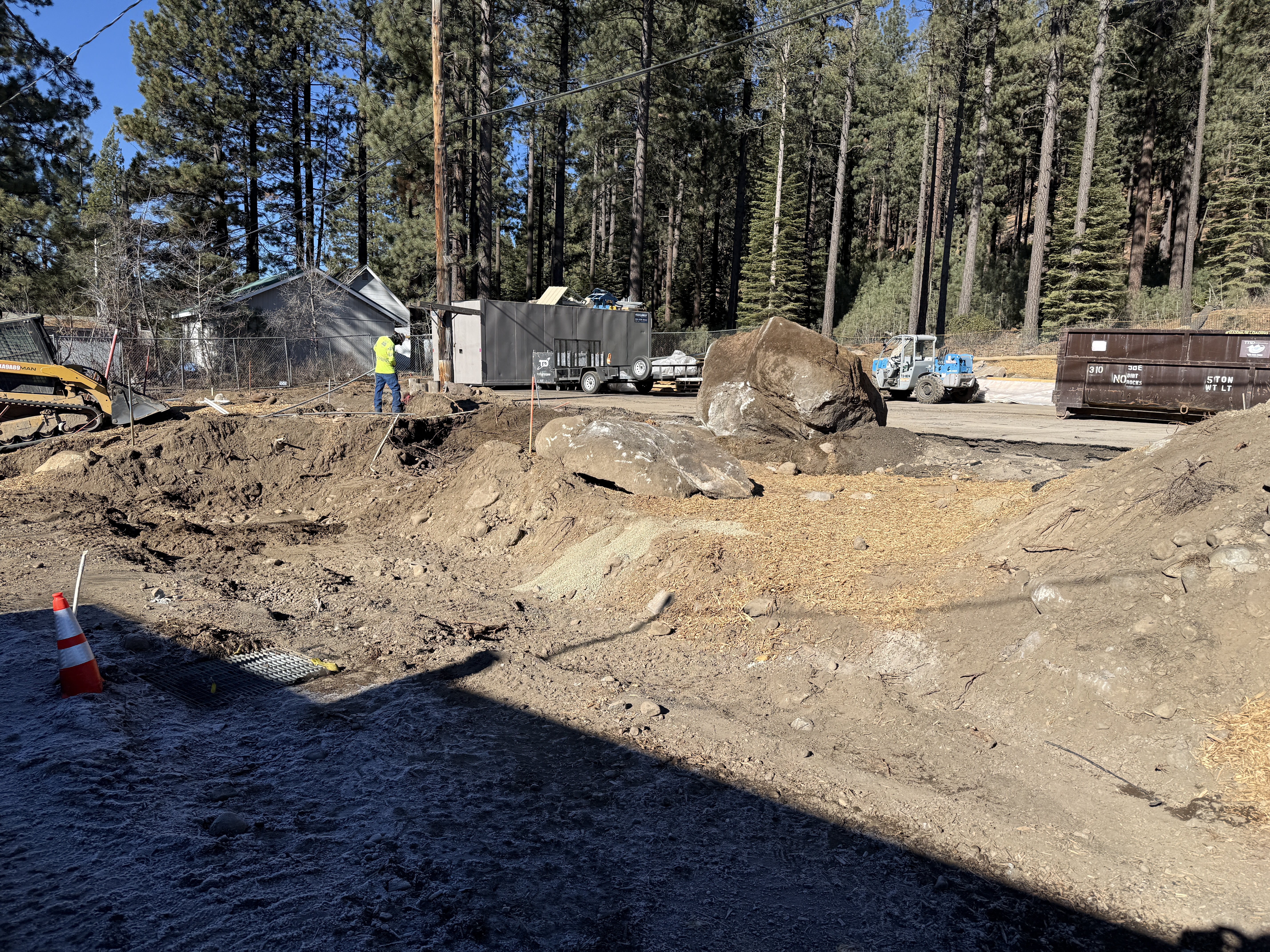 The image shows an active construction site with earthwork underway, specifically involving excavation of soil. A worker is present in the area, likely conducting assessment or site preparation. Large boulders and soil piles are visible, and heavy machinery is staged nearby. The project appears to be in the early stages of site preparation and excavation.