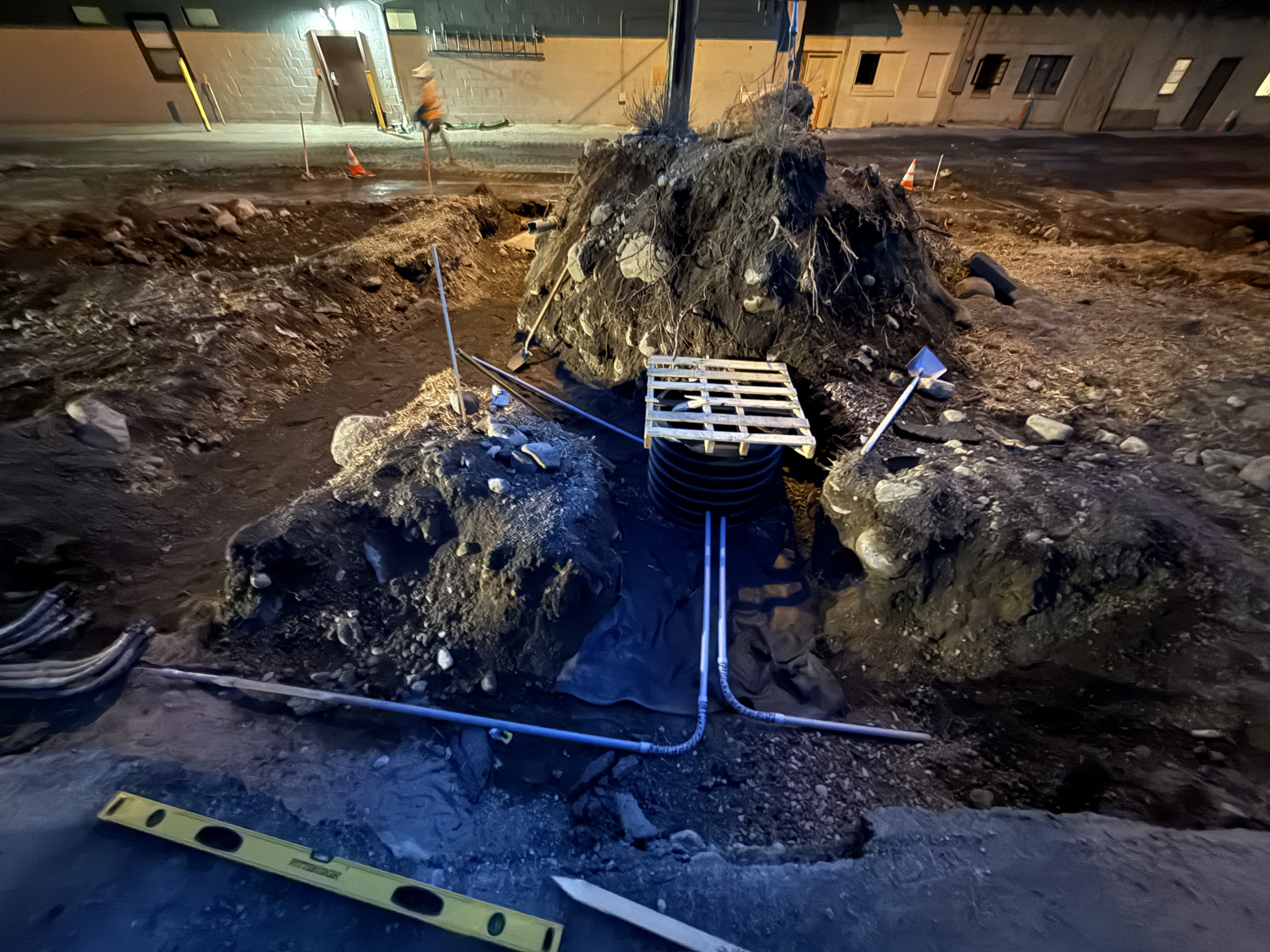 The photo depicts an active construction site involving the excavation of soil and installation of underground utilities. Visible is a large trench with exposed soil, a grated access cover placed over a coiled black drainage pipe, and various steel pipes indicating ongoing utility work. A worker is present, indicating active construction operations during nighttime under artificial lighting.