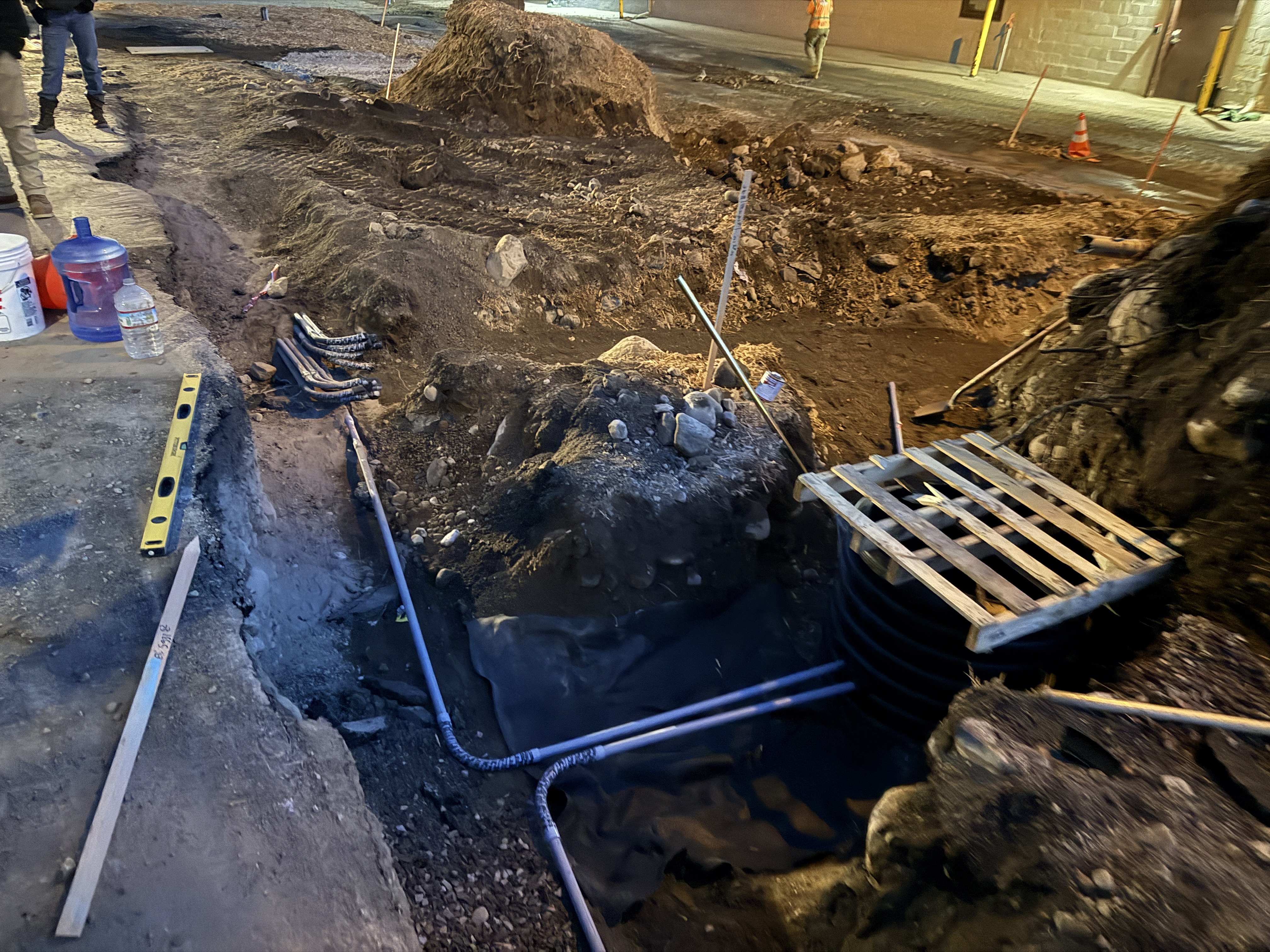 The image shows an active utility construction site with trenches excavated for underground installations. Visible are multiple conduits or pipes laid in trenches, suggesting ongoing pipeline installation work. A black corrugated pipe structure is present, covered by a wooden pallet, possibly indicating drainage or a similar function. The site appears organized but active, with tools and materials around the work area.