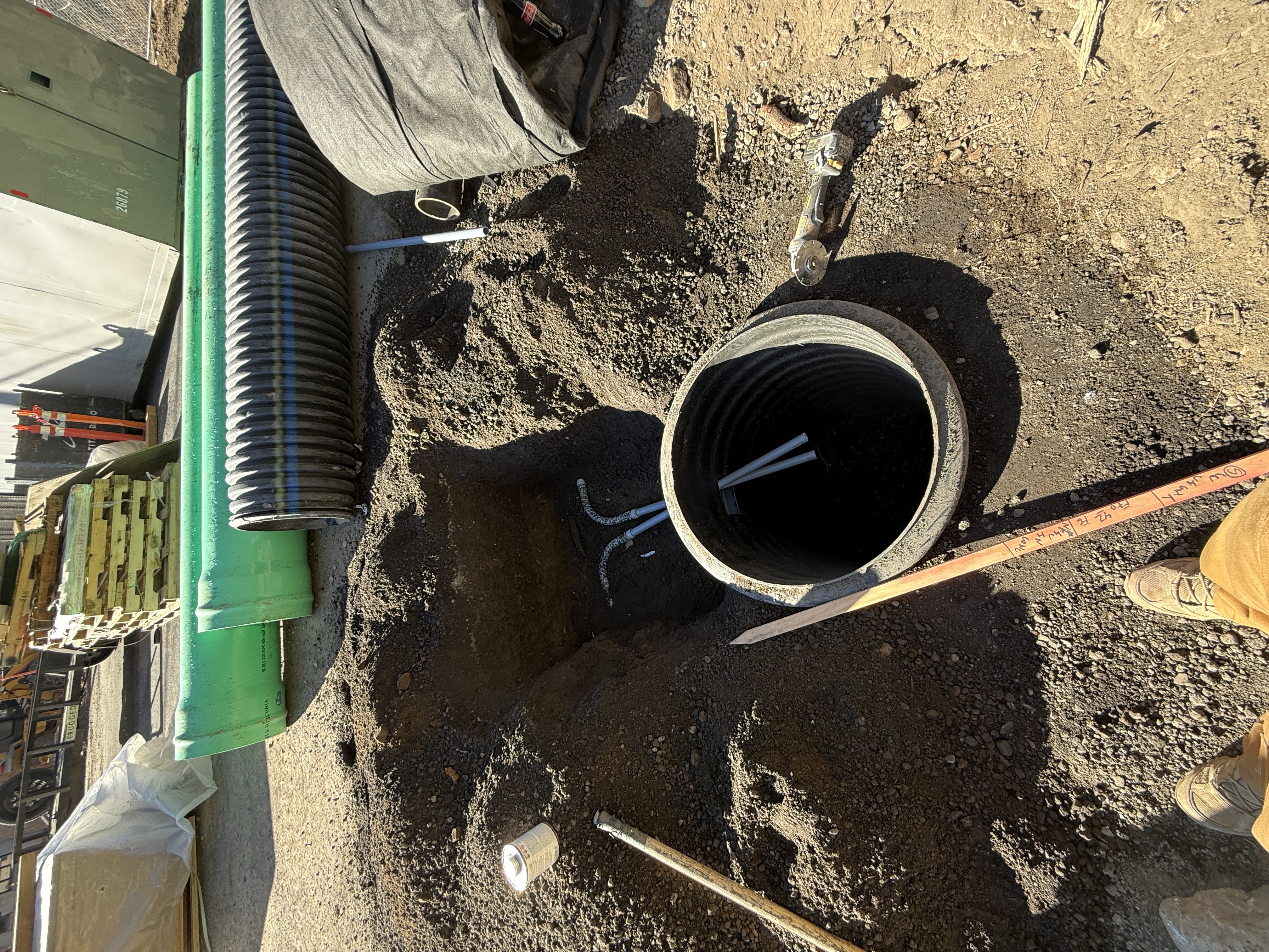 The image shows a trench excavation with a partially installed modular manhole system. Green PVC pipes are staged nearby, indicating upcoming pipeline installation. A wooden survey stake is visible, possibly marking elevation or alignment. The construction appears to be at the preparation and installation stage of underground utilities.
