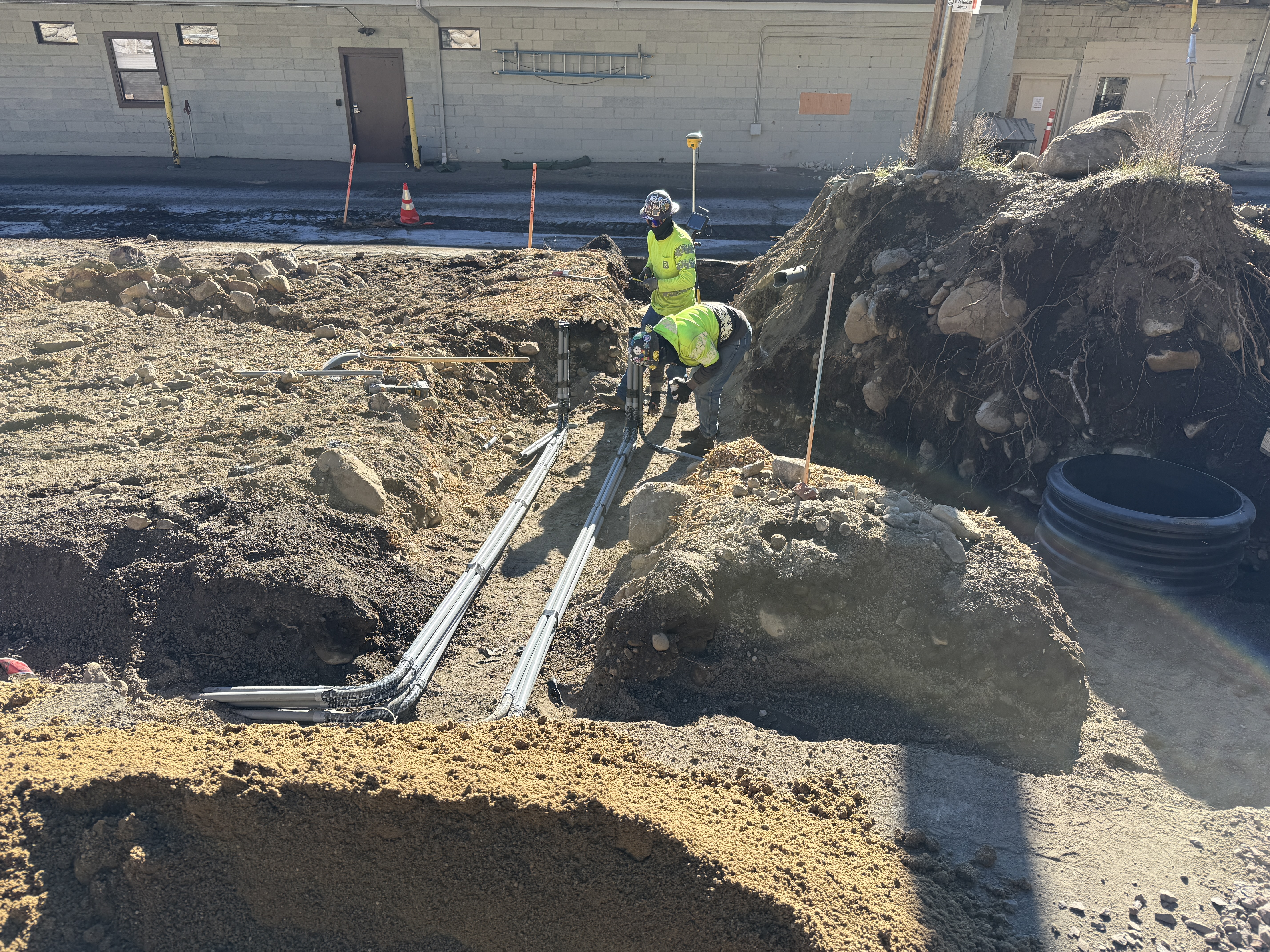 The photo depicts two construction workers engaged in the installation of underground utilities, specifically electrical conduits, as evidenced by multiple gray conduit pipes extending from the trench. The site appears to be in the mid-stage of construction, with extensive trenching and conduit placement underway. Soil and rocky materials are piled nearby, indicating ongoing excavation activities.