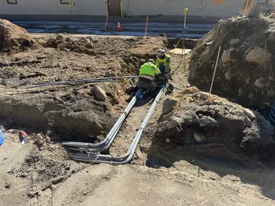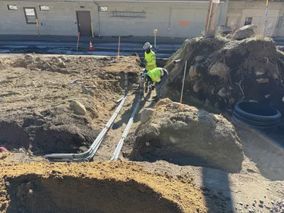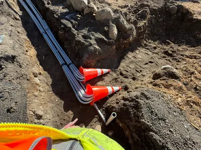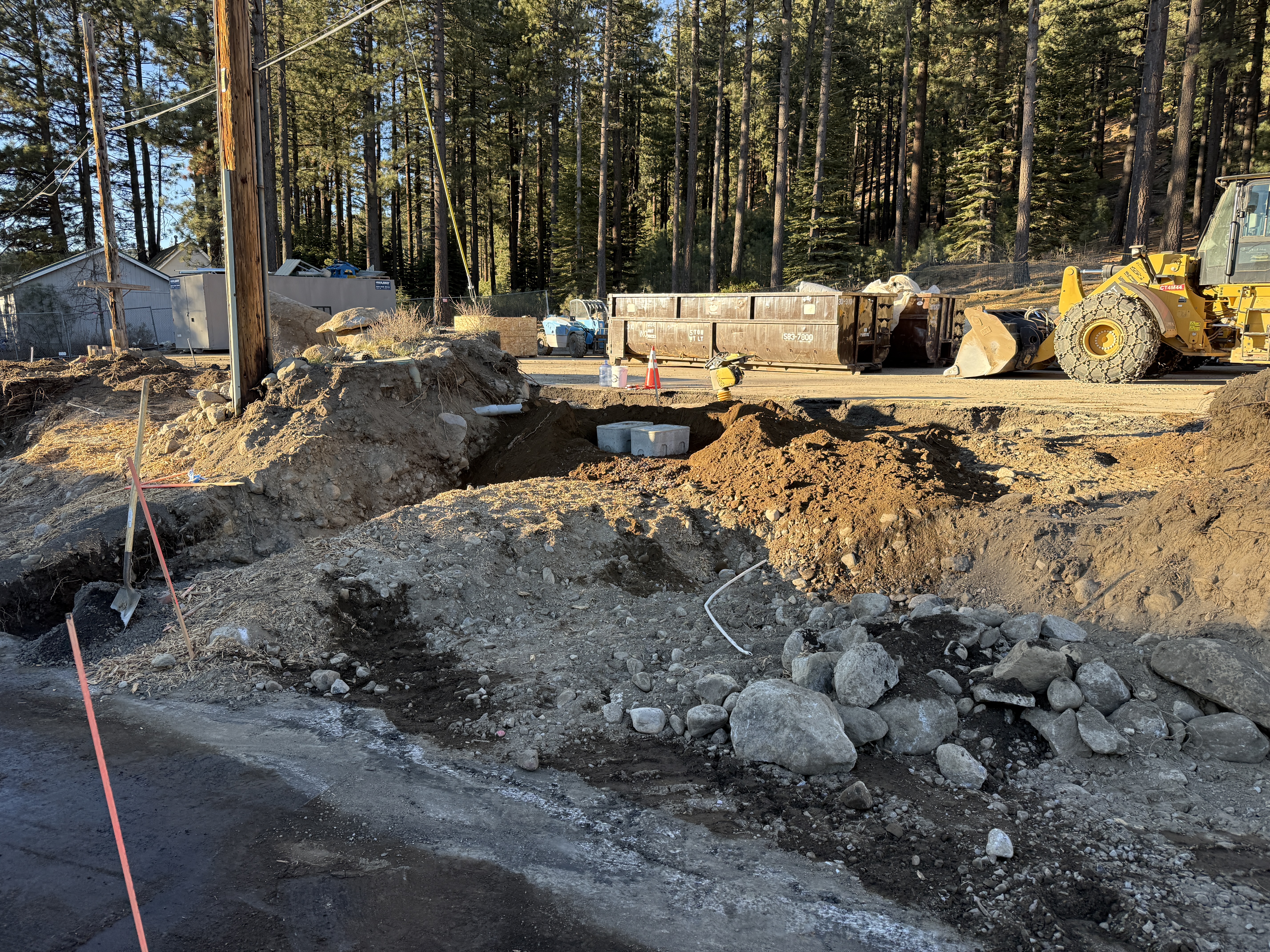 The image depicts an active water infrastructure construction site, showing a stage of trench excavation with exposed soil and rocks. A yellow front loader is visible, possibly used for moving or removing soil. Utility poles and some exposed pipes suggest preparation or installation of underground utilities. The site appears to involve typical excavation activities for laying underground pipelines.