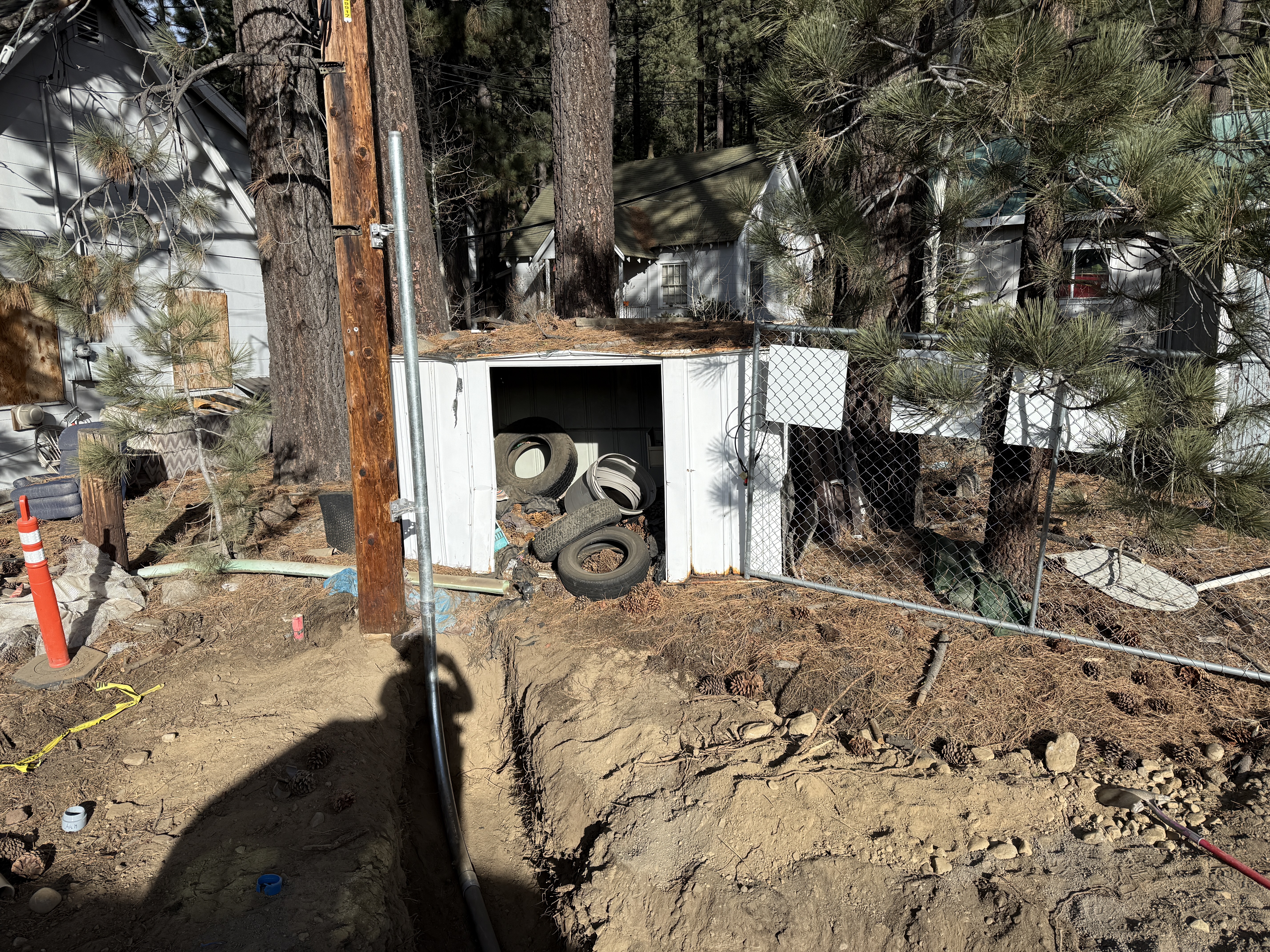 The photo shows an on-site active excavation work with a focus on trench digging for underground utility installation. Visible in the image are a trench, exposed soil, a utility pole, and materials such as tires and a fenced-off enclosure. The construction stage appears to be early to mid-phase trenching for potential utility installation.
