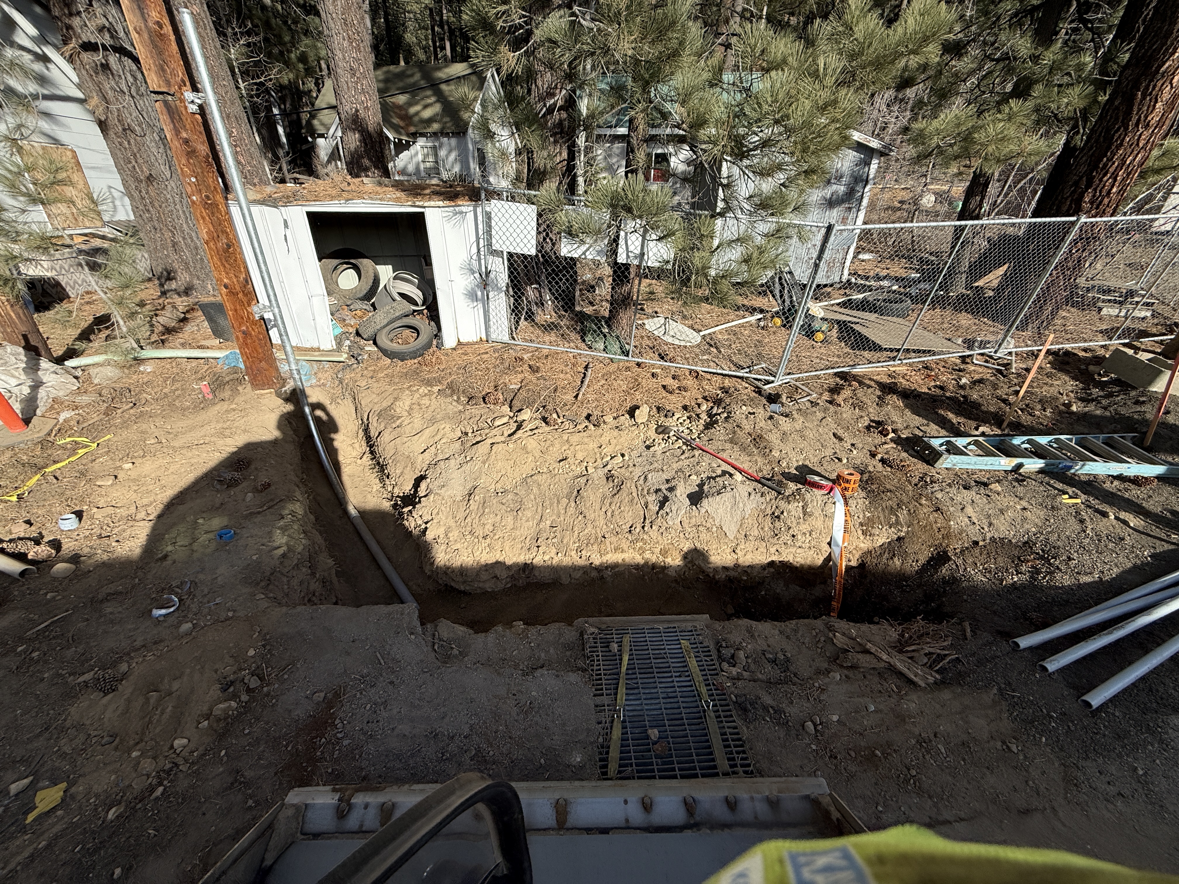 The photo shows an open trench with a newly installed electrical conduit running through it, indicating ongoing underground utility infrastructure work. A fenced area with storage of tires and materials is visible in the background. The site is in the excavation phase, with some equipment and materials staged around the area. There is a utility pole on the left side of the trench, suggesting progressing electrical work.