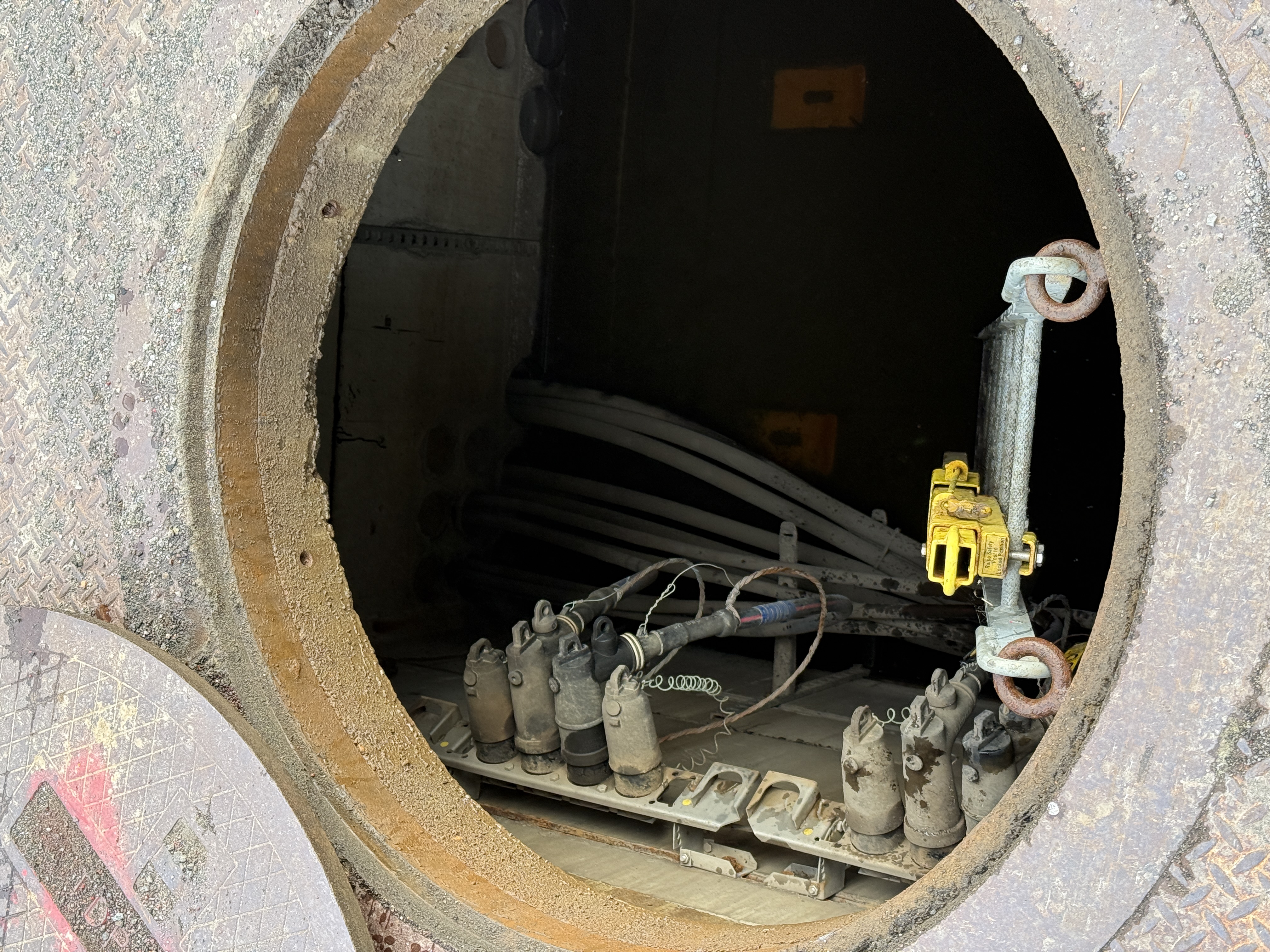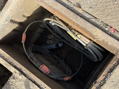 The image shows an open manhole with visible utility cables and associated hardware. A yellow pipe support clamp is attached to a metal support bar within the manhole. The scene suggests ongoing underground utility work, focusing on electrical or communication line maintenance or installation.