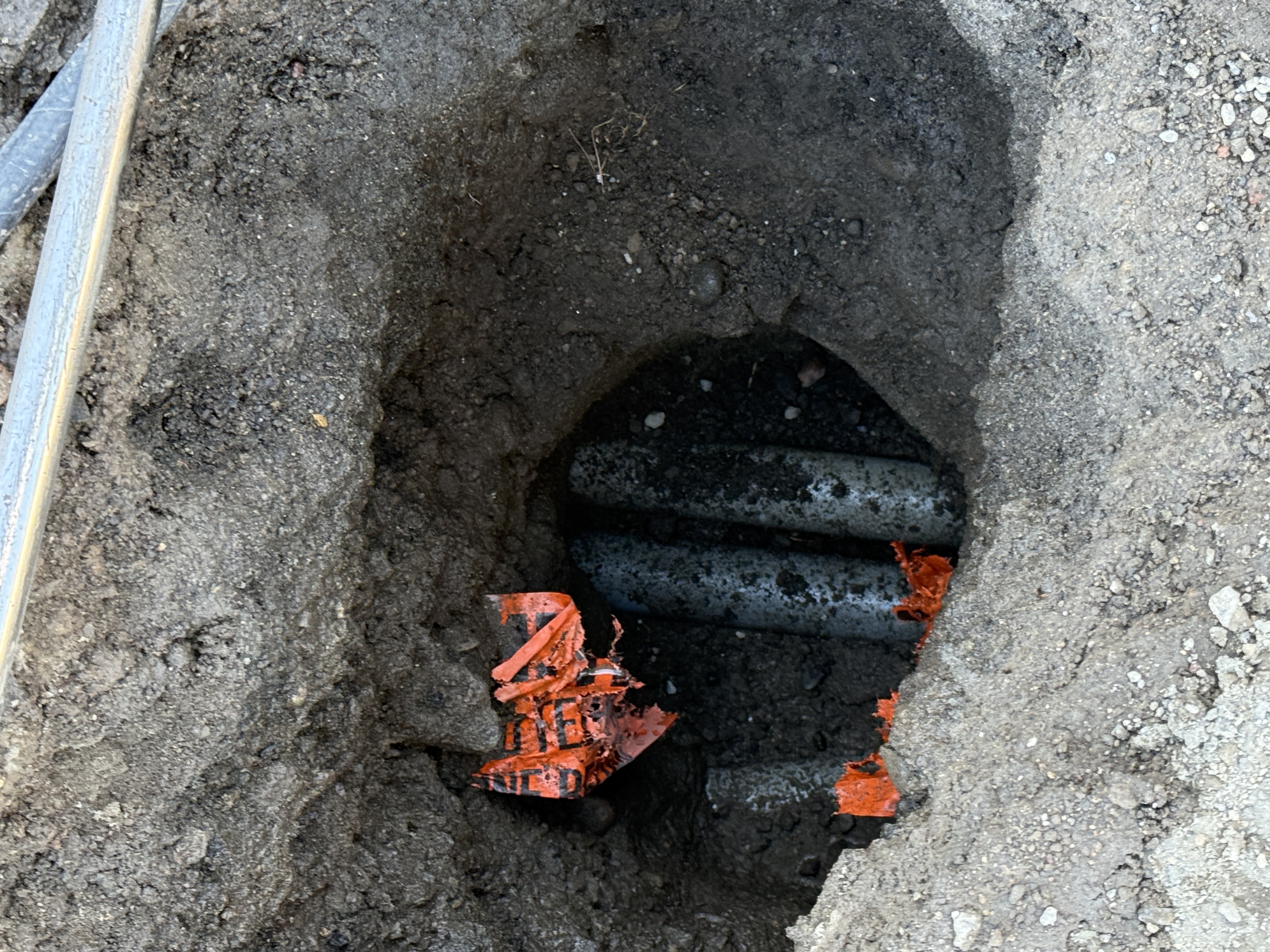 The photo shows a trench with exposed underground utility work, specifically involving three visible capped pipes with an orange warning mesh partially visible above them. The construction stage appears to be at the pipeline installation phase, where protective warning materials are utilized above the pipes. The trench is clearly excavated, with compacted earth surrounding the infrastructure.
