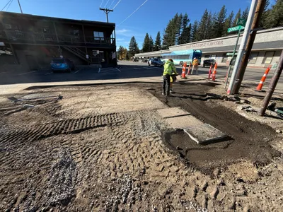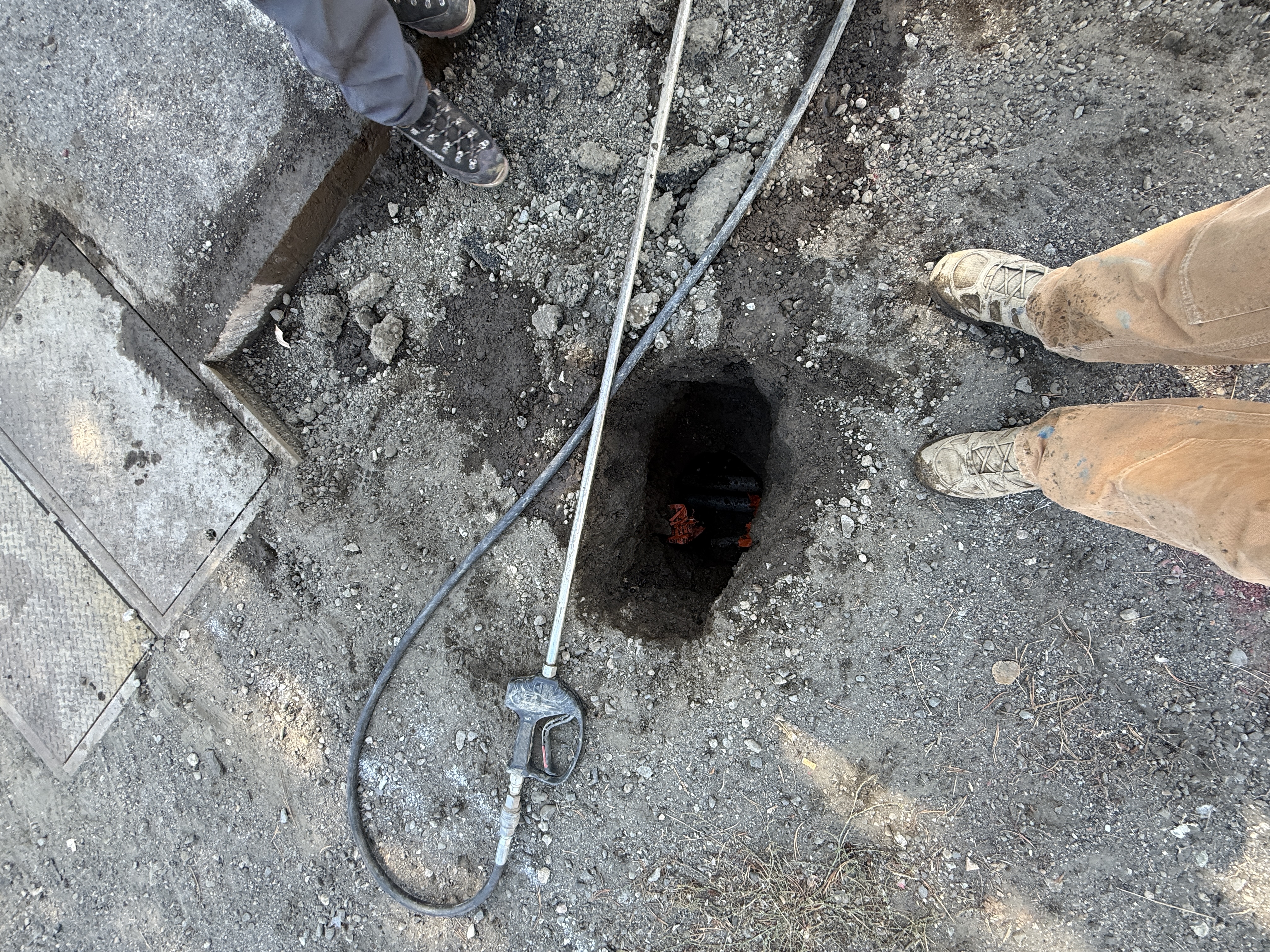 The image shows an excavation site where a hole has been dug, exposing underground utilities. A pressure washing tool is placed beside the excavation indicating cleaning or preparation work. The site appears to be in the mid-stage of construction with visible conduits at the bottom of the hole, suggesting preparation for pipeline installation or maintenance.