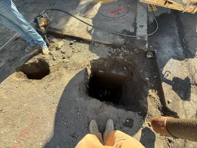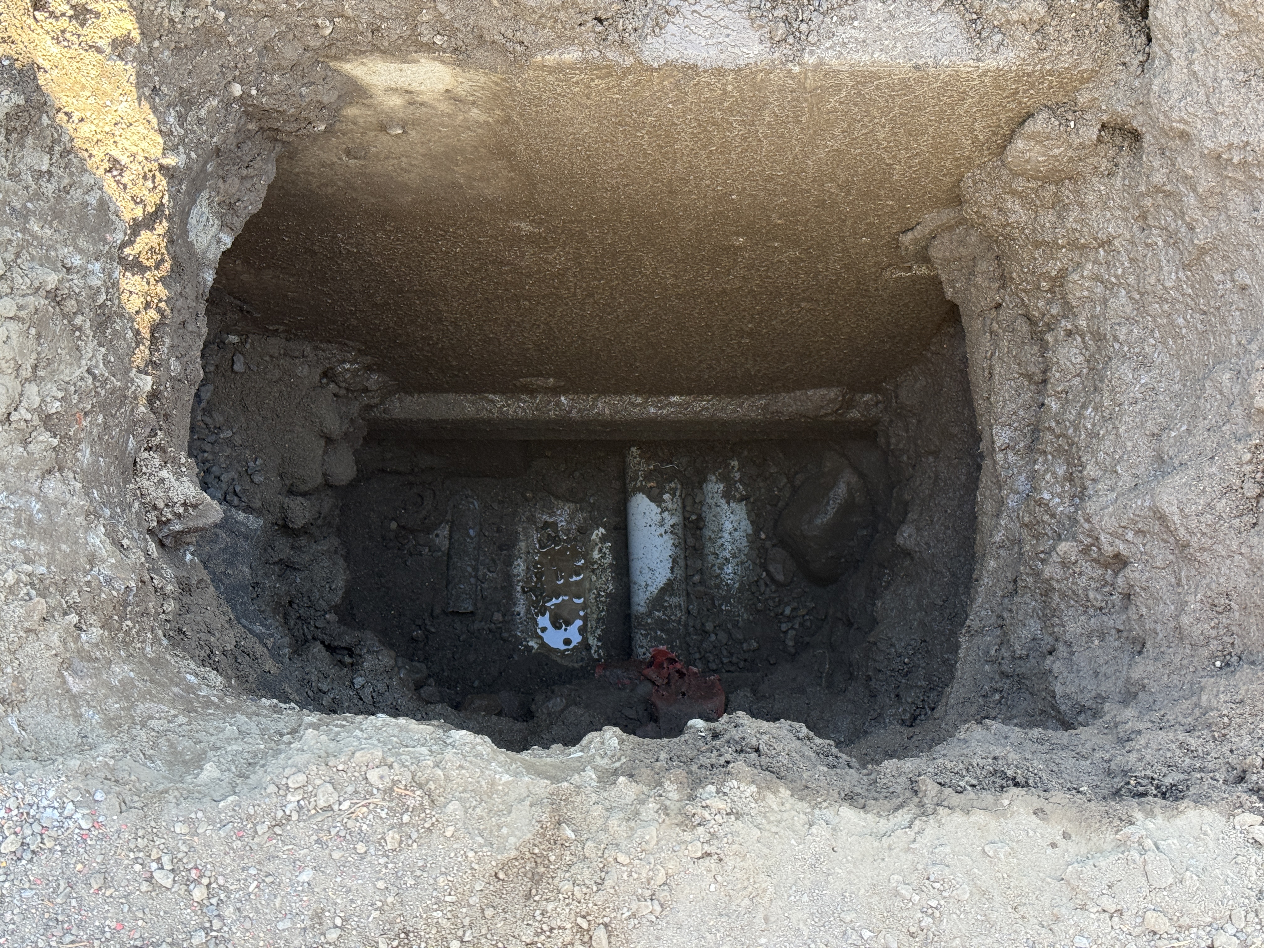 The image captures a section of a utility trench showing what appears to be partially exposed underground piping. The trench walls appear to be mud-covered, suggesting recent excavation activity. Visible is a segment of metallic pipe, possibly either in the process of being installed or inspected, located in an early stage of construction.