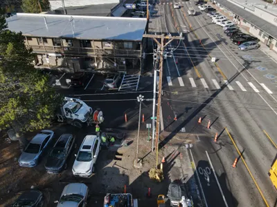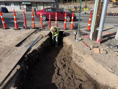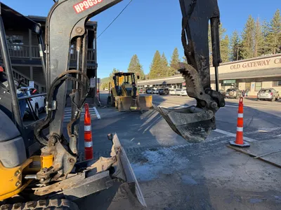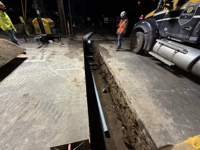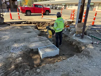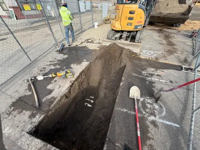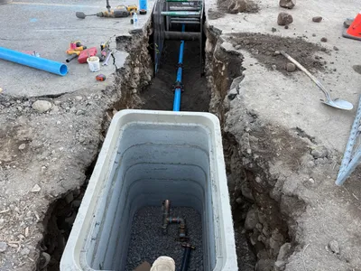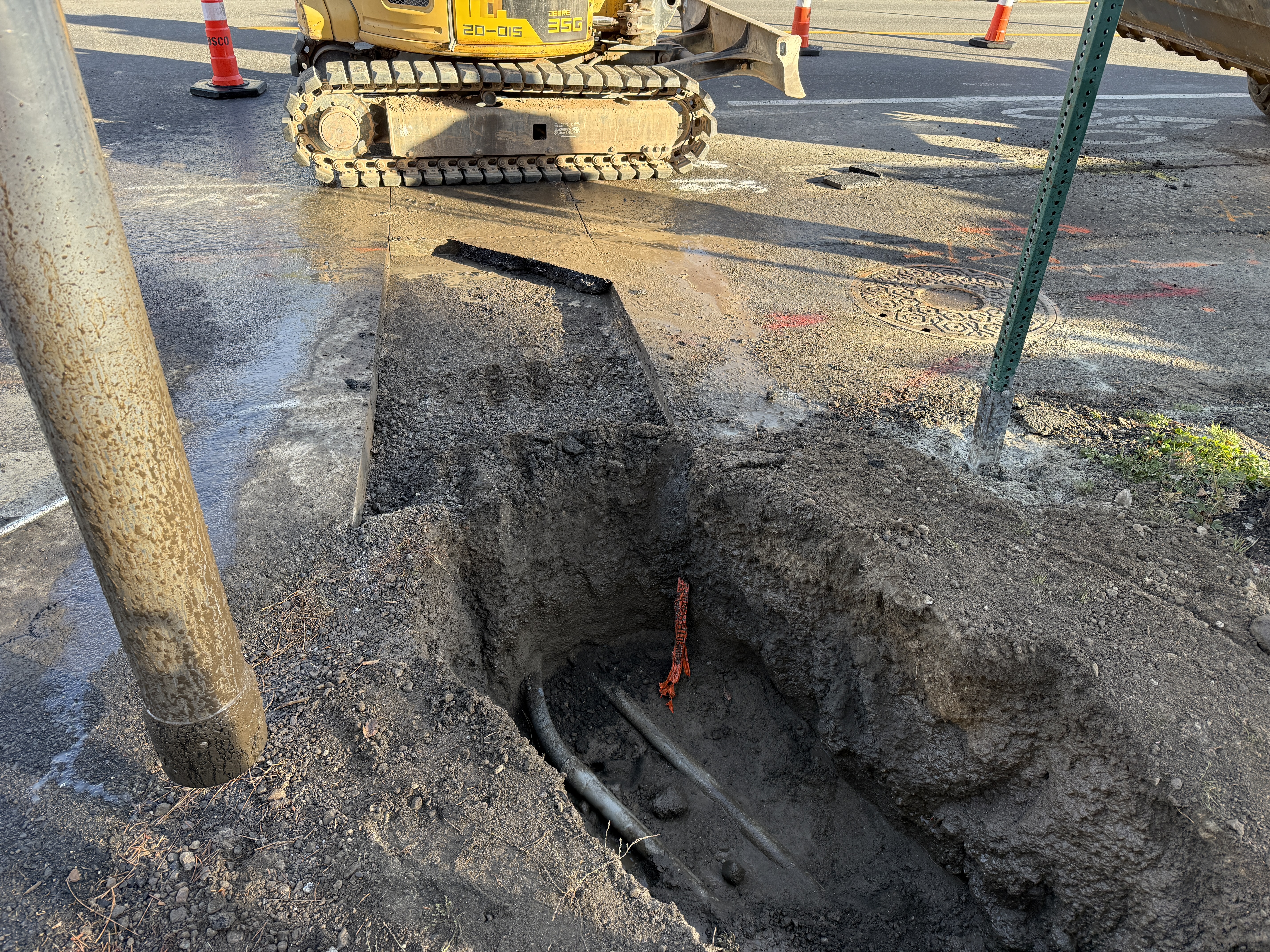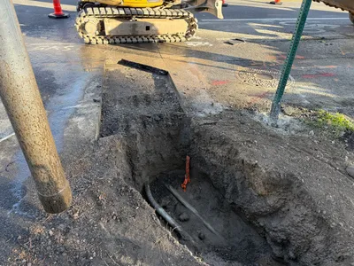 The image depicts an excavation area with a trench visible for underground utility work. A piece of heavy machinery, a tracked excavator, is seen adjacent to the trench, suggesting active digging operations. Pipes within the trench are exposed, likely part of a water infrastructure installation. The presence of cones and a rusty pole indicates an organized work zone, possibly in a mid-construction phase.