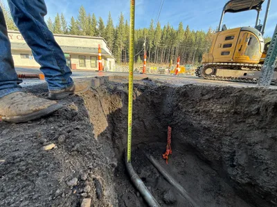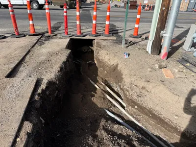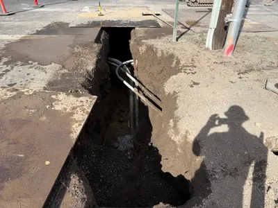 The photo shows an excavation site with a freshly dug trench. A measuring tape is being used to check the depth, indicating this is possibly for utility installation. The site has basic civil infrastructure elements visible, such as heavy machinery and orange safety barriers, suggesting ongoing preparation for underground utility work.