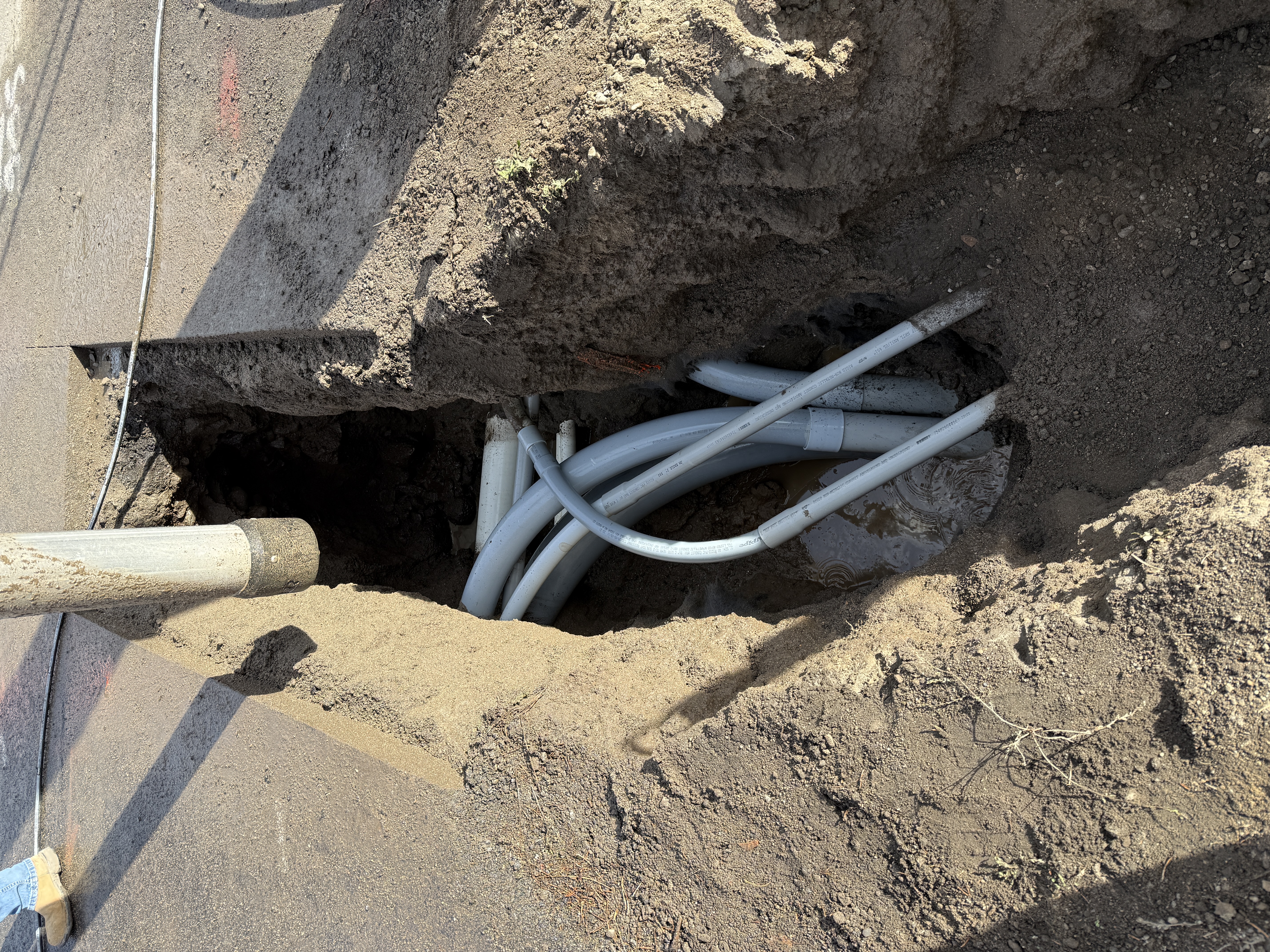The image shows a trench excavation with multiple electrical conduits visible, suggesting work on underground utility lines. The conduit pipes appear to be PVC and are partially submerged in water, indicating possible site drainage issues or recent precipitation. A light pole base is visible, suggesting possible street or highway lighting installation.