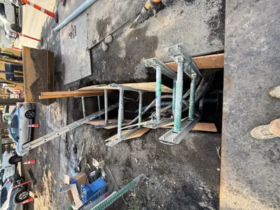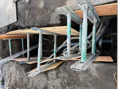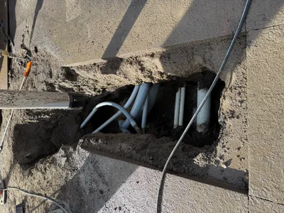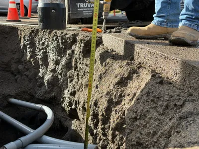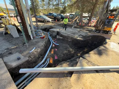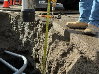 The photo shows workers at an active construction site engaged in trench excavation for underground utility work. Electrical conduits are visible within the trench, suggesting an ongoing installation of electrical infrastructure. The workers are performing measurements, likely to ensure correct trench depth and conduit placement. The site appears clean and organized, with protective measures in place to manage pedestrian and vehicle access.