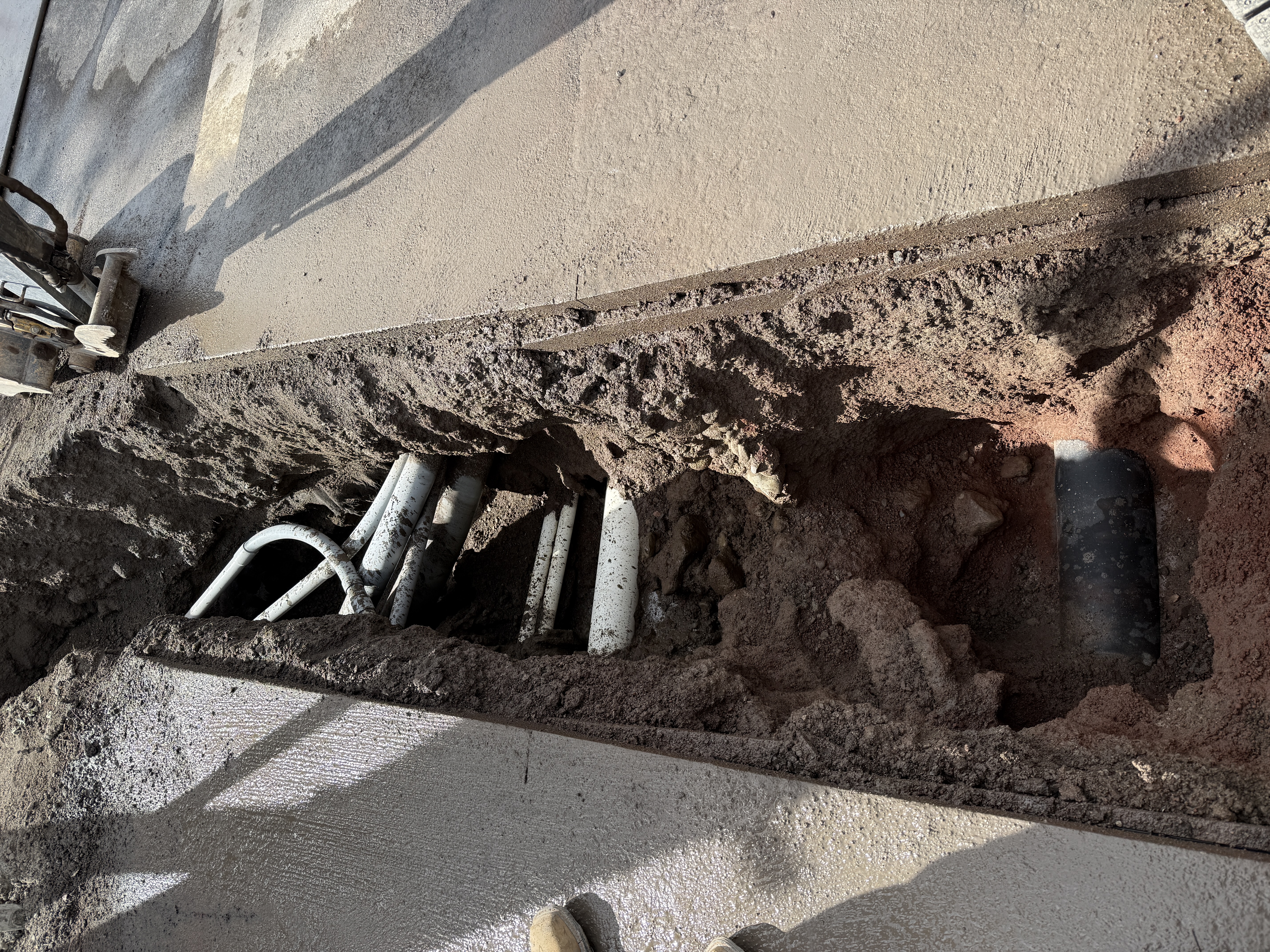 The image shows a trench excavation with exposed electrical conduits laid underground. The conduits are organized in a cluster, indicating an ongoing stage of underground utility installation. The trench appears freshly dug with soil piles visible along the sides, and a portion of a concrete slab has been removed to access the buried utilities.