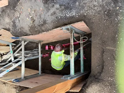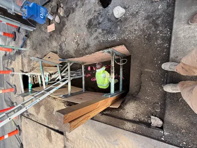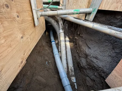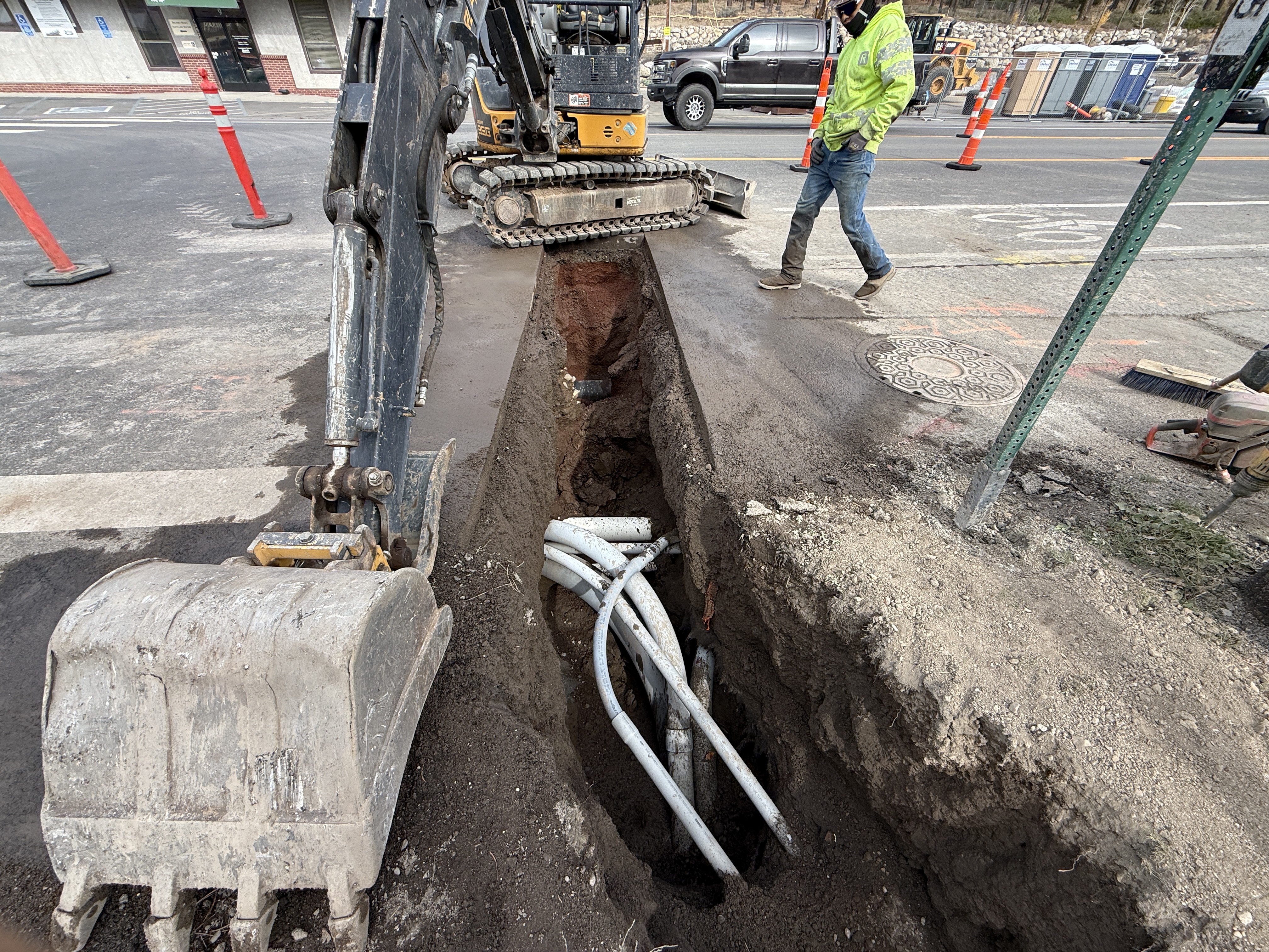 An excavator is actively digging a trench alongside a paved road to install underground utility conduits. Several white PVC electrical conduits are visible, indicating the infrastructure work in progress. The construction stage involves trench excavation and utility conduit placement, with the trench appearing deep and neatly dug.