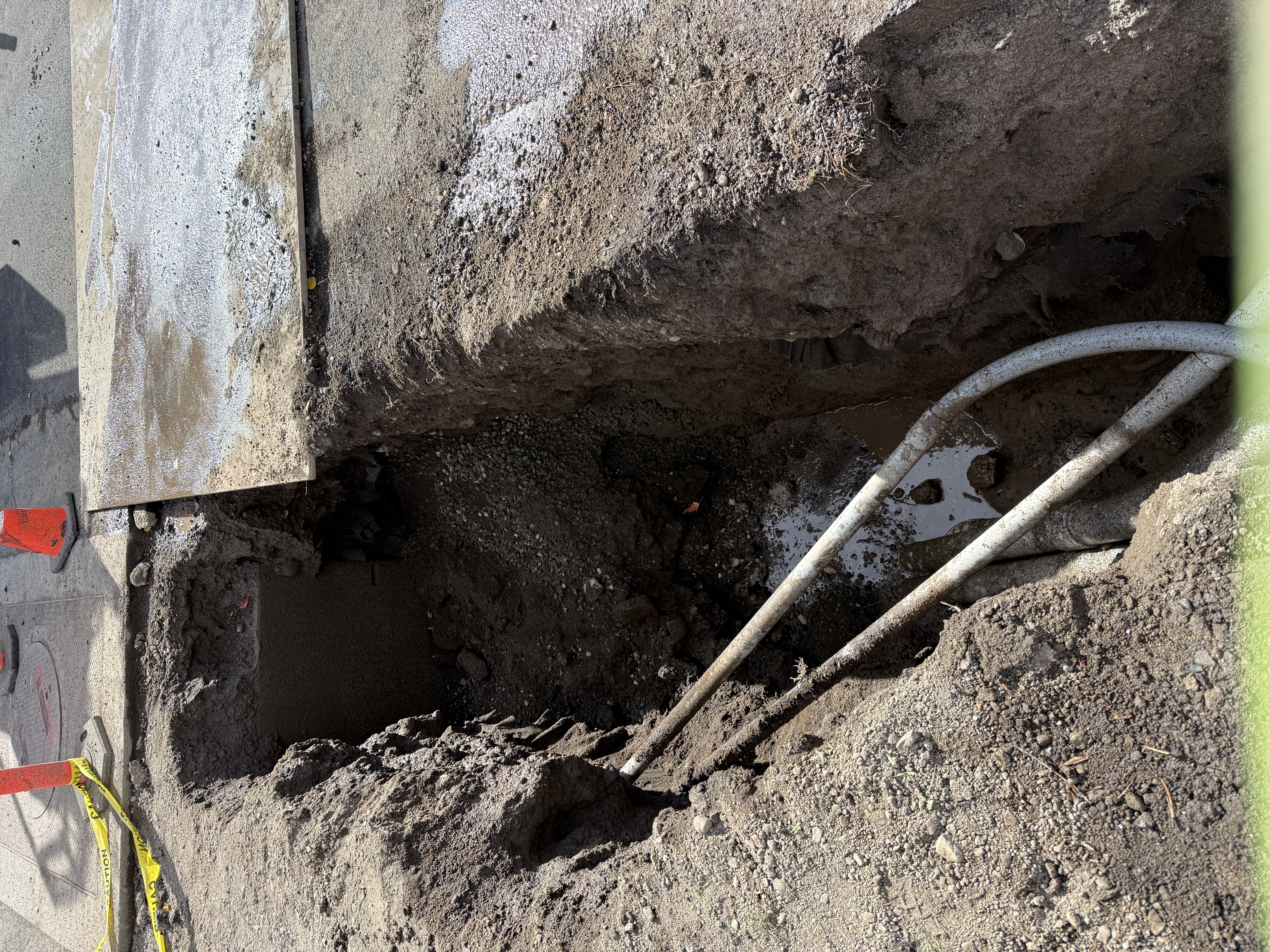 The photo depicts an active trench excavation with exposed utility pipes, likely for water infrastructure work. The trench is partially filled with water, indicating possible groundwater penetration or recent rain. Metal pipes run the length of the trench, and a metal plate partially covers the excavation area.