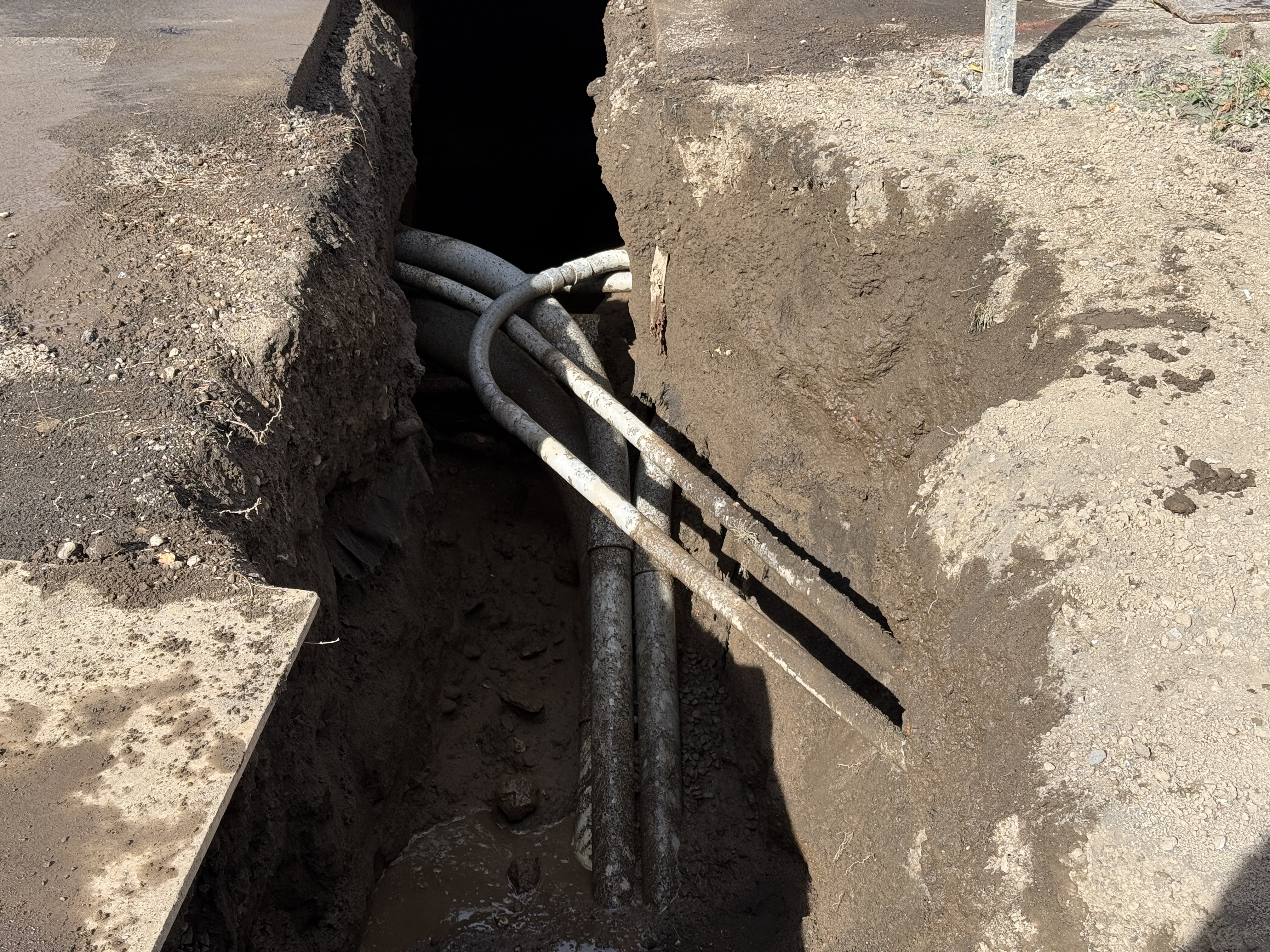 The photo shows a trench excavation with exposed utility pipes, likely for a water infrastructure project. Several steel or galvanized pipes are visible, indicating underground utility work in progress. The trench appears freshly dug, with soil piled along the edges, and the construction is likely in an early to mid-phase.