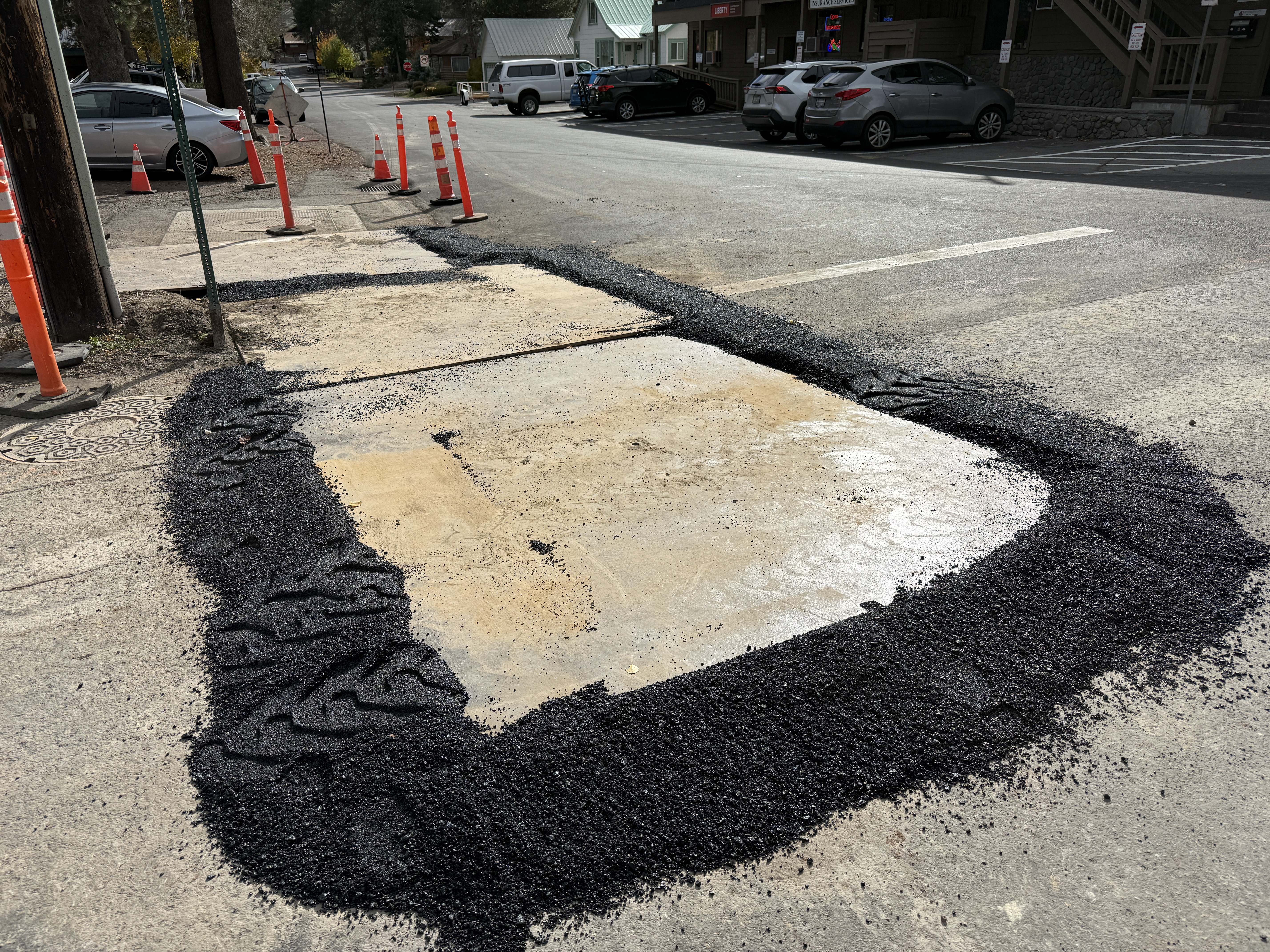 The photo shows a section of a roadway undergoing surface restoration, where a previous excavation site is being backfilled with new asphalt over a concrete base. The area is bordered by traffic cones indicating the work zone. Fresh asphalt is unevenly applied, suggesting ongoing work in the final stages of surface completion.