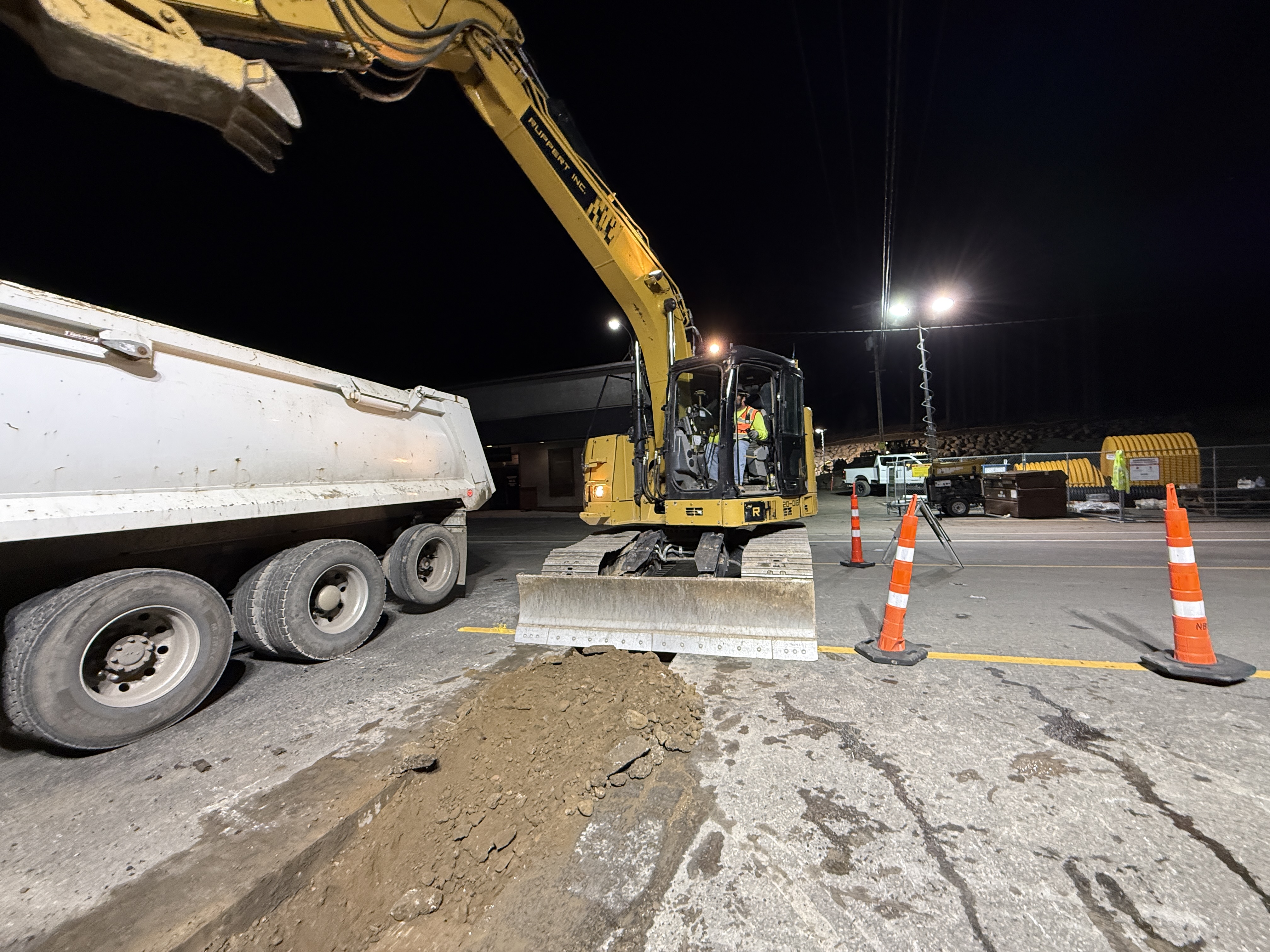 The image depicts nighttime excavation work in progress for a water infrastructure project. A construction worker operates a CAT excavator, loading excavated soil into a nearby dump truck. The area is well-lit by portable lighting, with traffic cones marking the work zone boundaries. The excavation appears to be for underground utility work, possibly involving trenching for pipeline installation.